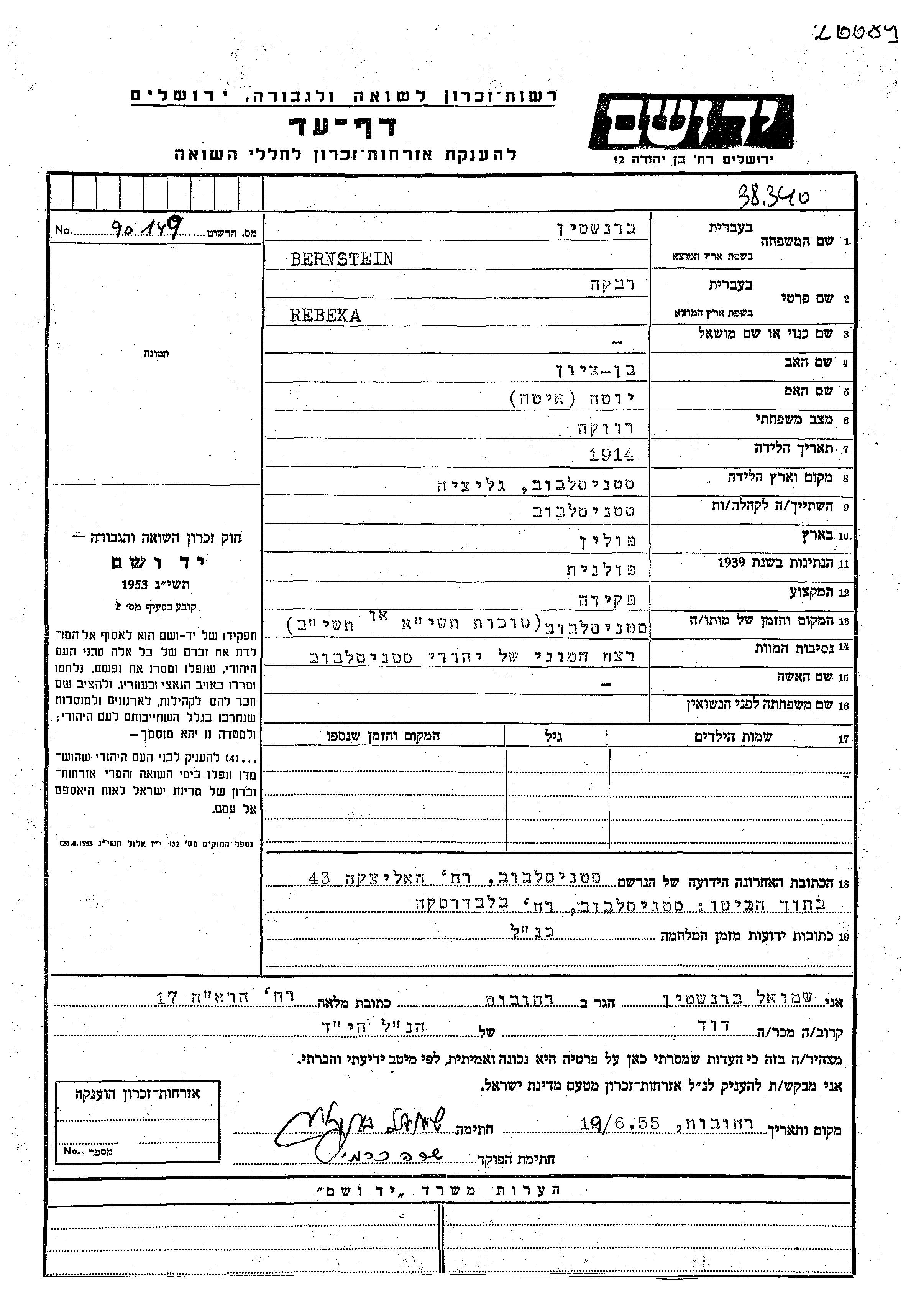Bernstein Rebeka 1914 Stanislawow, Pologne Feuille de témoignage