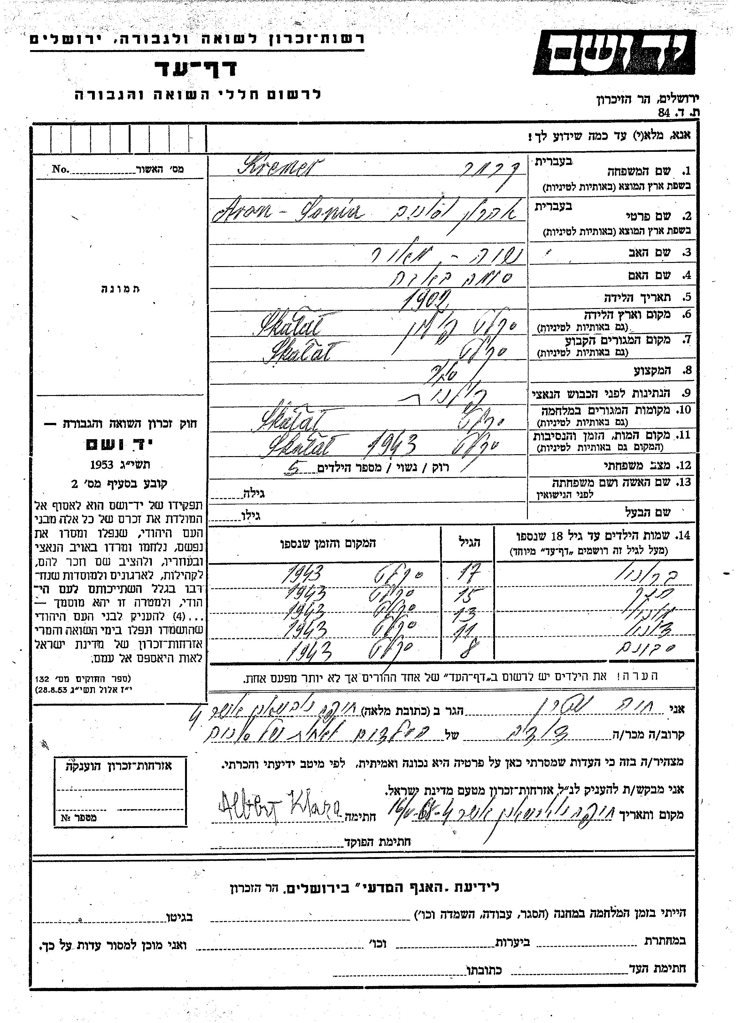 Kremer Sonia 1902 Skalat, Pologne Feuille de témoignage