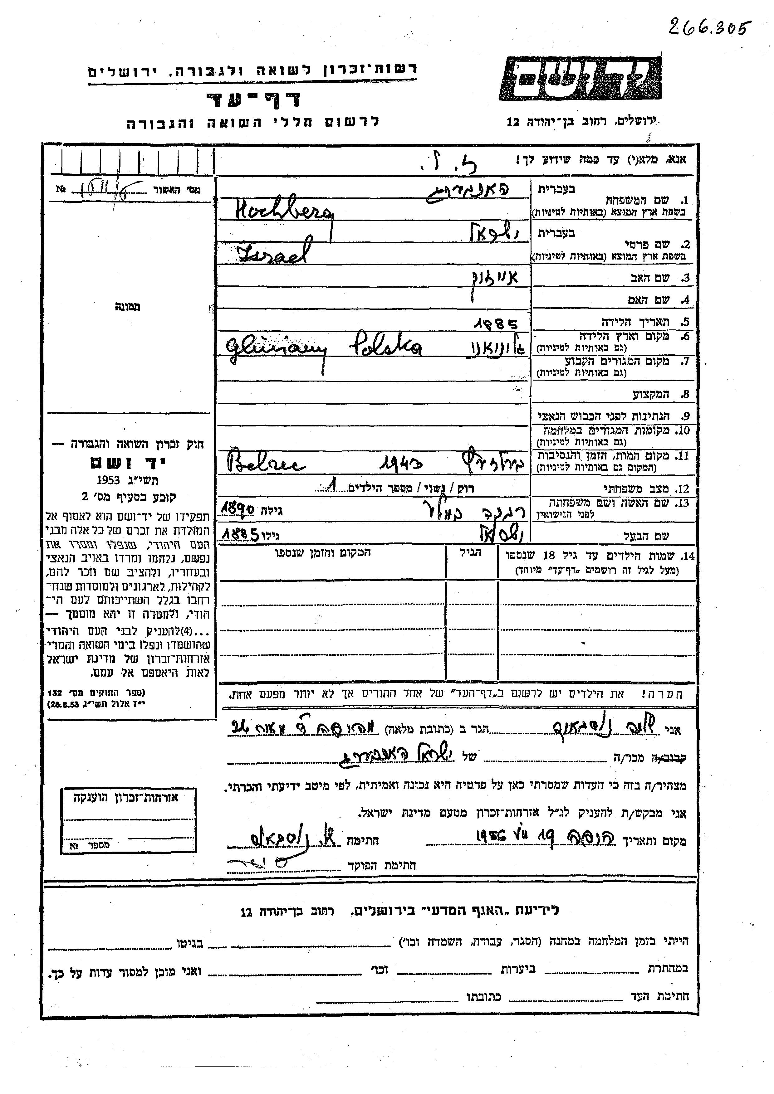 Hochberg Israel 1885 endroit inconnu, Feuille de témoignage