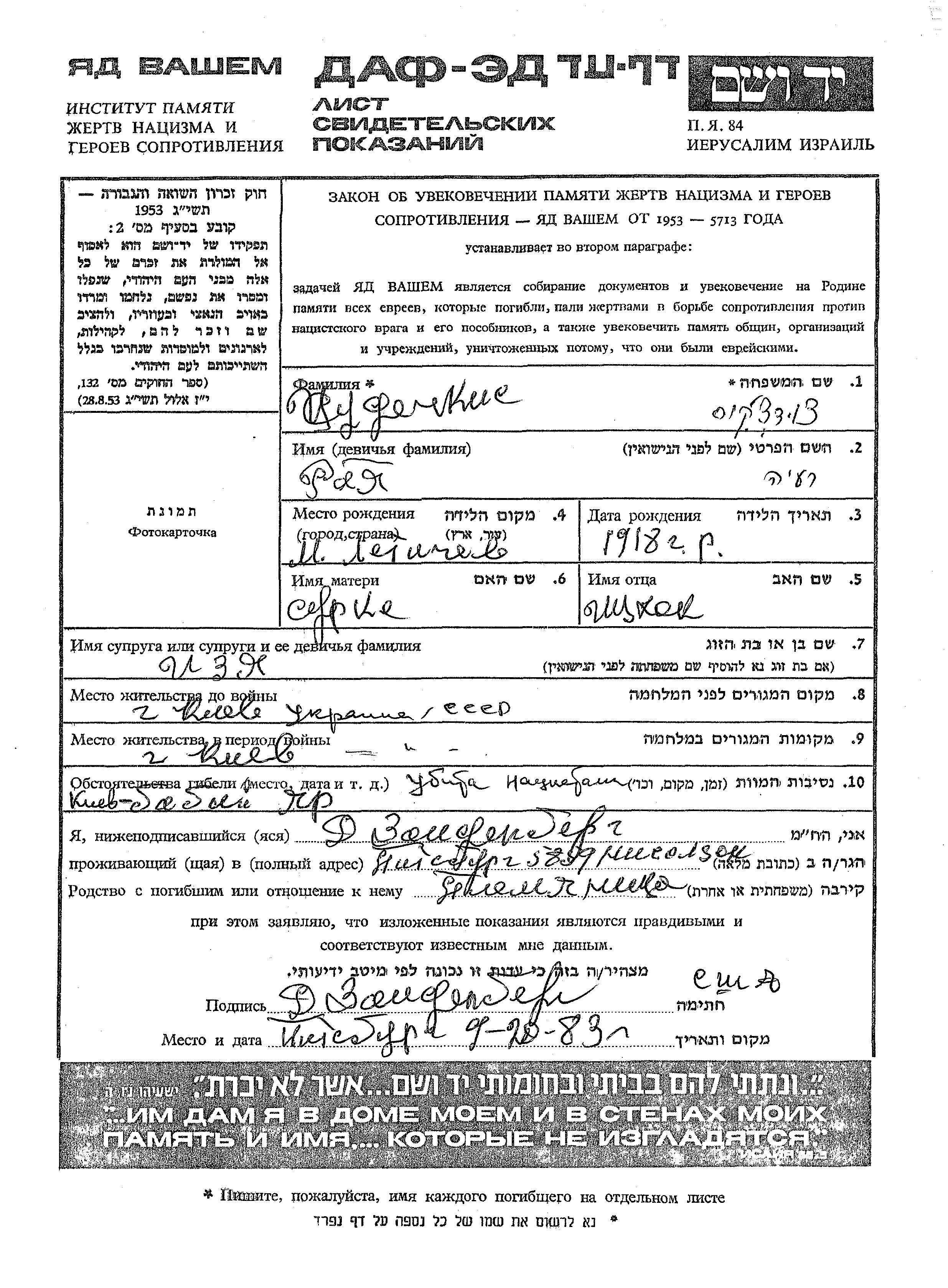 Tzudechkis Raya 1918 Kiev, Ukraine (URSS) Feuille de témoignage