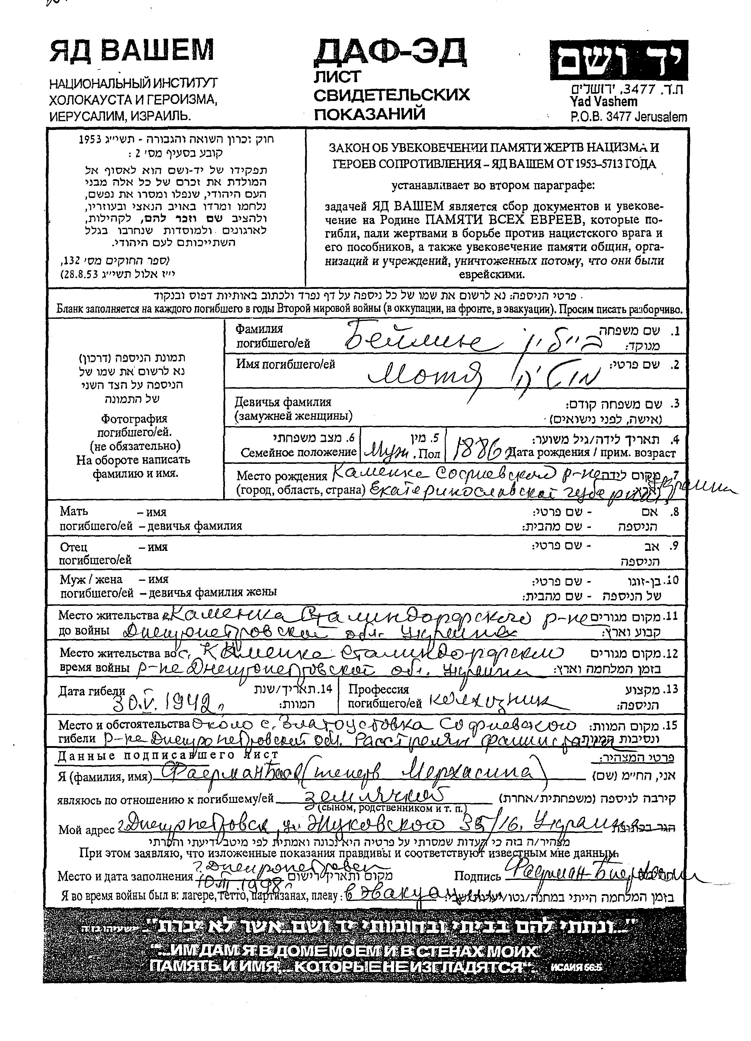 Beilin Motya Motia 1886 Kamenka, Ukraine (URSS) Feuille de témoignage