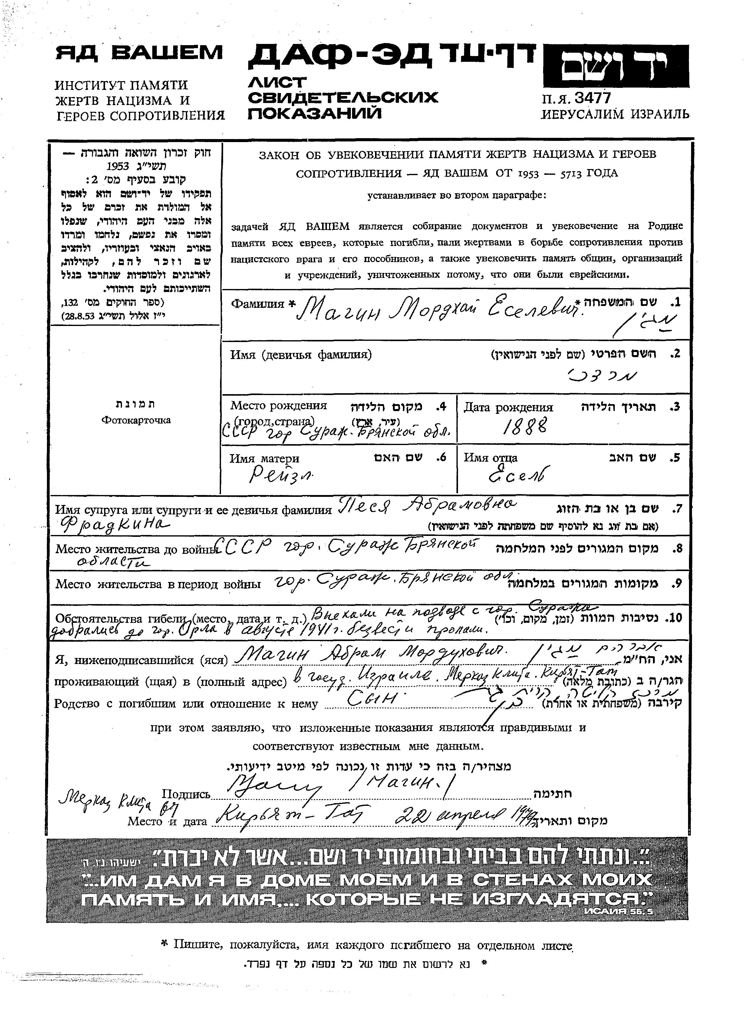 Magin Mordkhai 1888 Surazh, Bélorussie (URSS) Feuille de témoignage