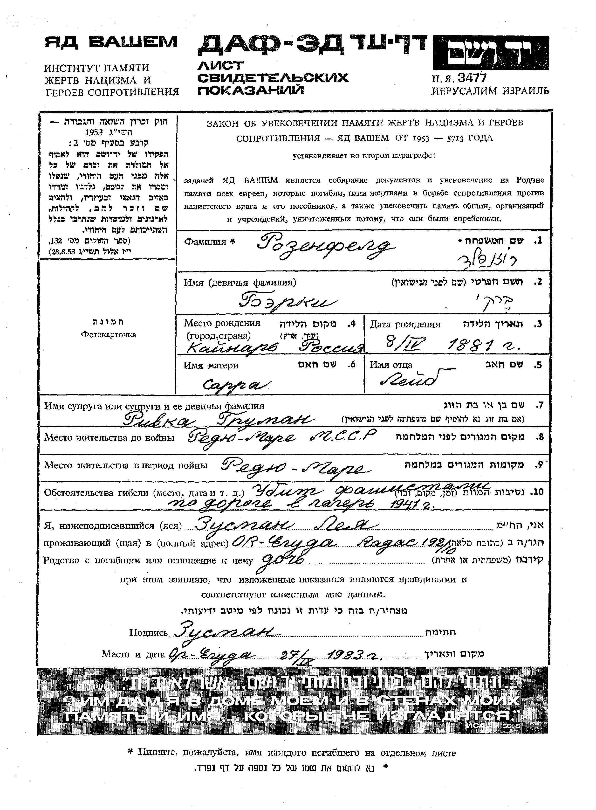 Rozenfeld Ber 1881 Redyu Mare, Roumanie Feuille de témoignage