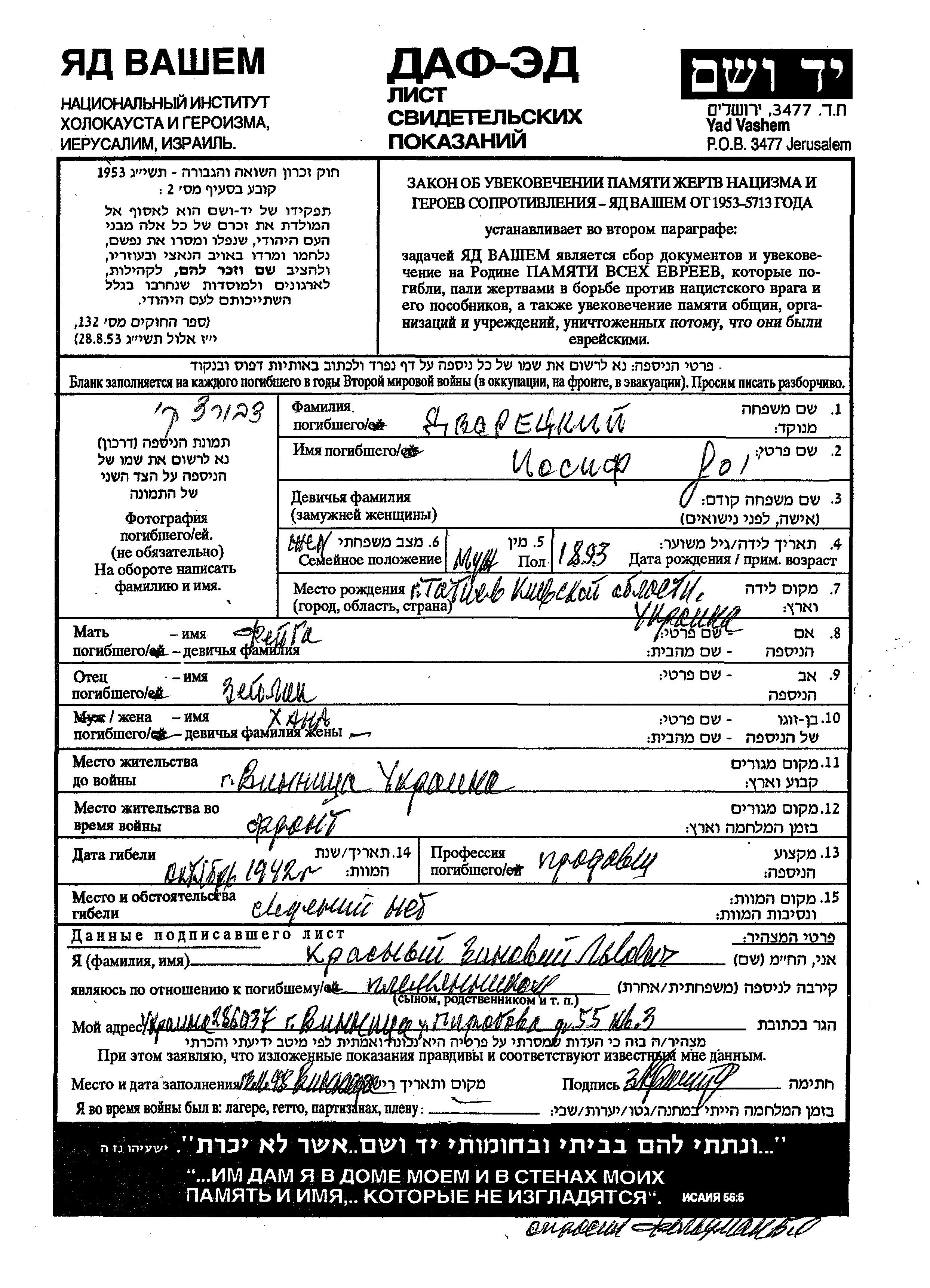 Dvoretzki Iosif 1893 Vinnitsa, Ukraine (URSS) Feuille de témoignage