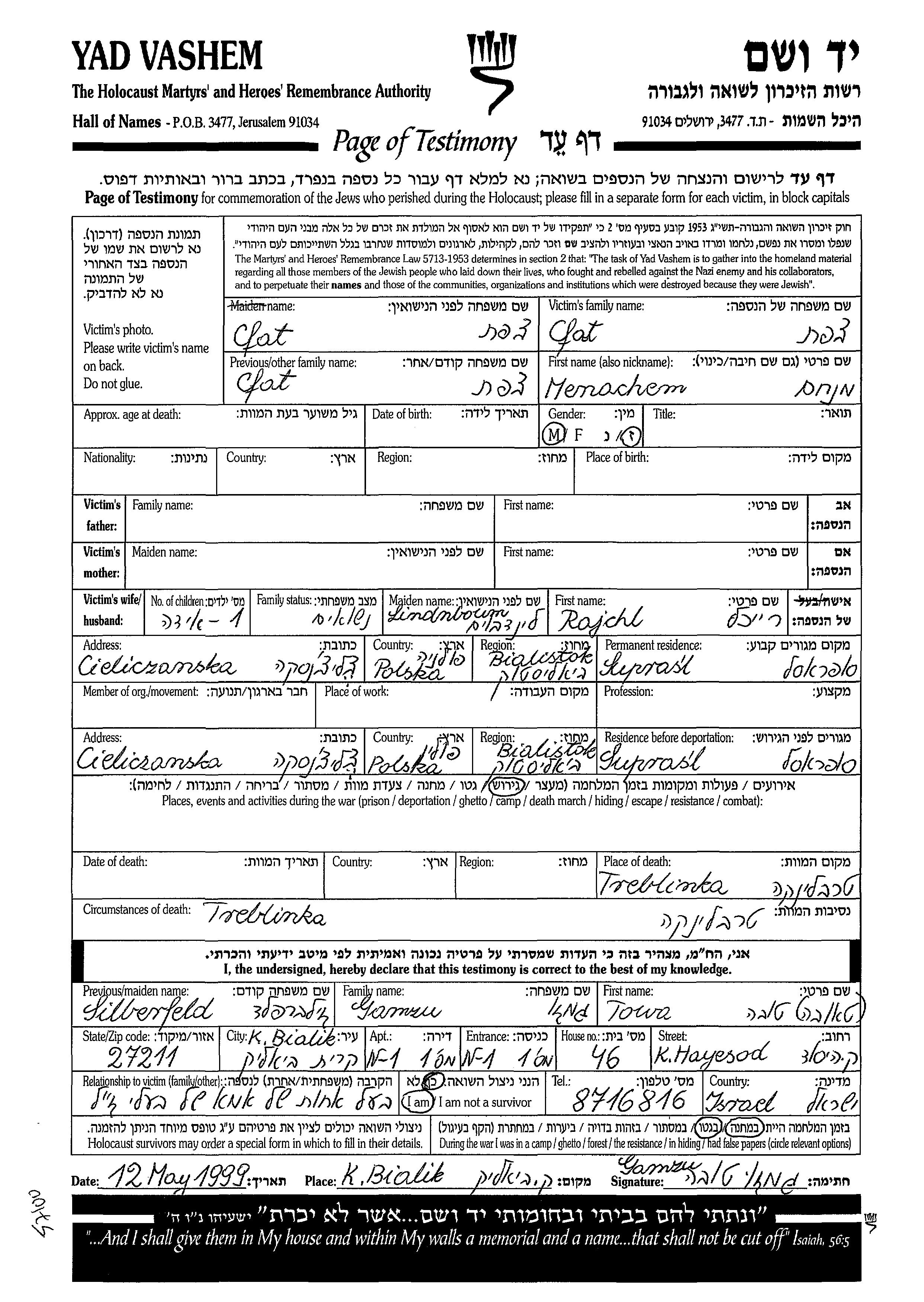 Menachem Cfat. Il était Mariée à Rajchl née Lindnboum. Avant la seconde guerre mondiale il vivait à Suprasl, Pologne. Au cours de la guerre, il était à Suprasl, Pologne.