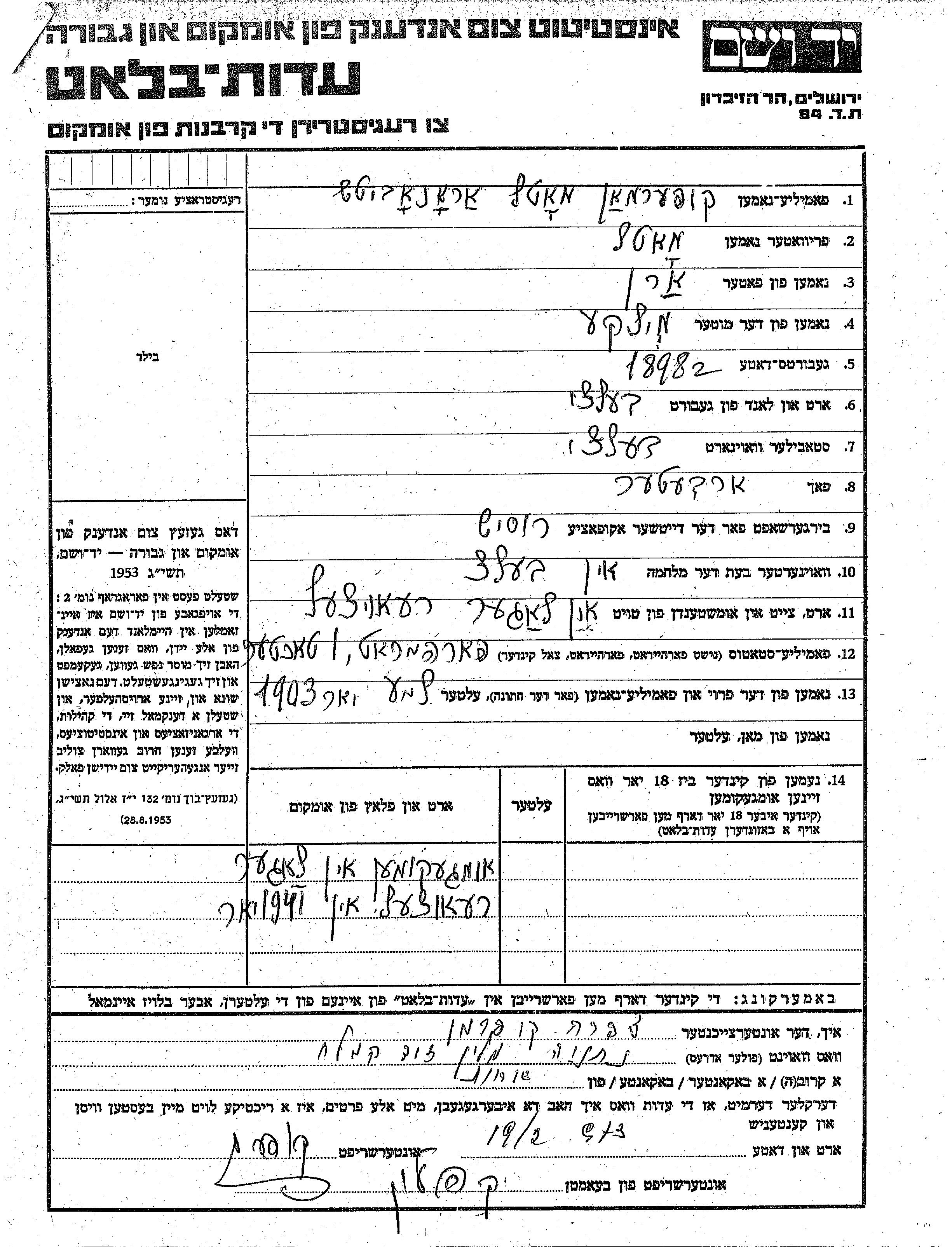 Kuperman Matl 1898 Bălți, Roumanie Feuille de témoignage
