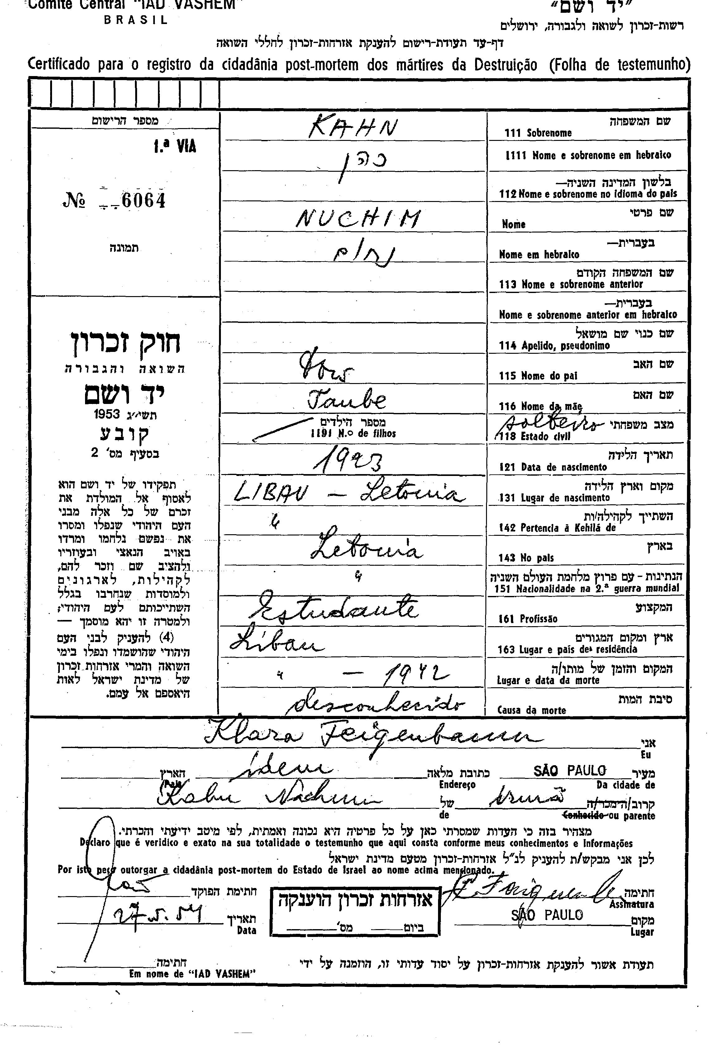 Nuchim Kahn Kohen est né à Libau, Lettonie en 1923, fils de Dow et de Tauba. Il était Étudiant/e et Célibataire. Avant la seconde guerre mondiale il vivait à Libau, Lettonie. Au cours de la guerre, il était à Libau, Lettonie.