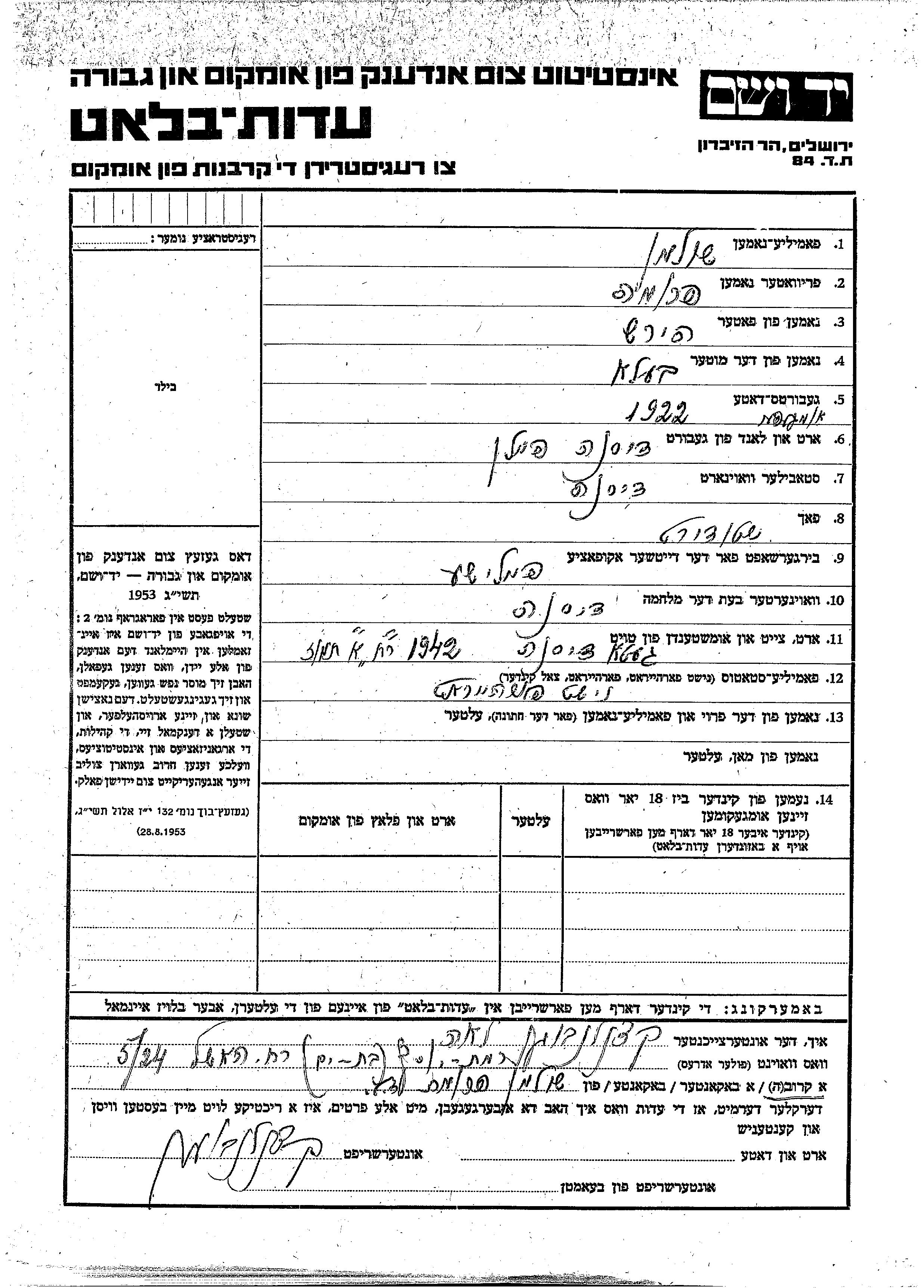 Shulman Fruma 1922 Disna, Pologne Feuille de témoignage