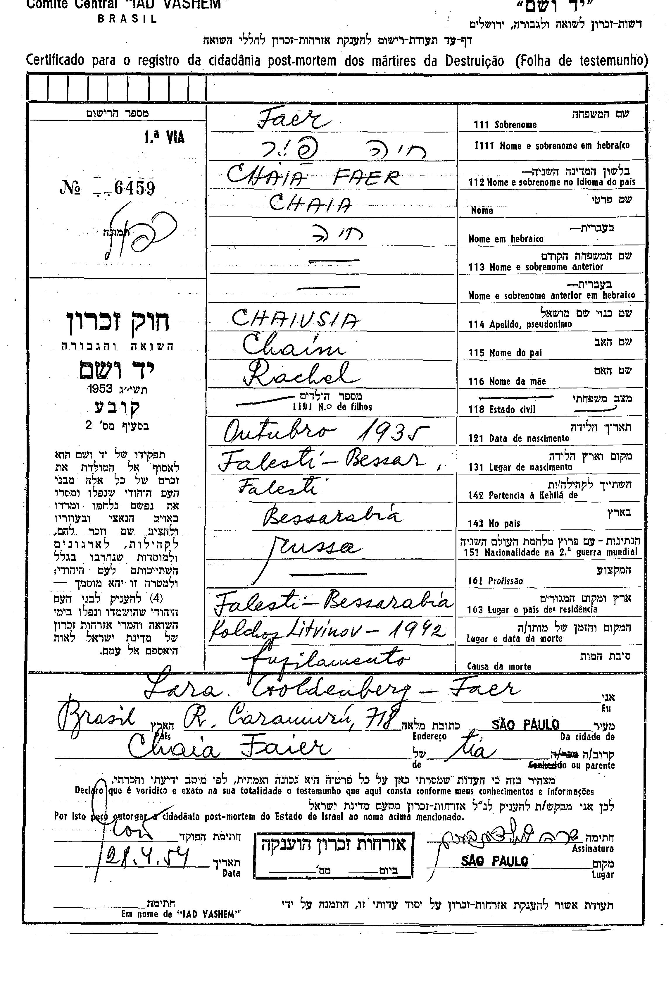 Faer Chaia 1935 Falesti, Roumanie Feuille de témoignage
