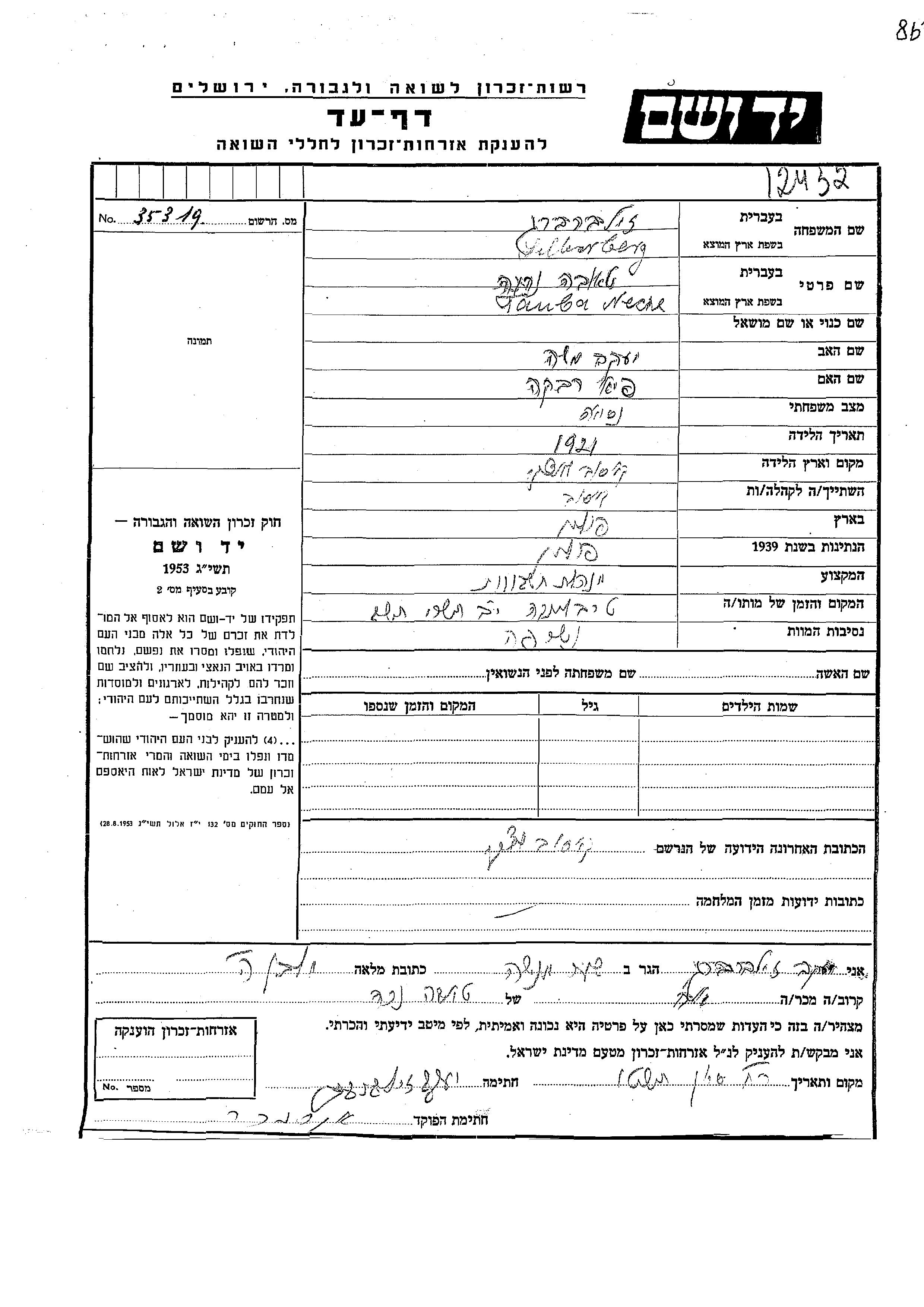Yad Vashem - Pages of Testimony Names Memorial Collection