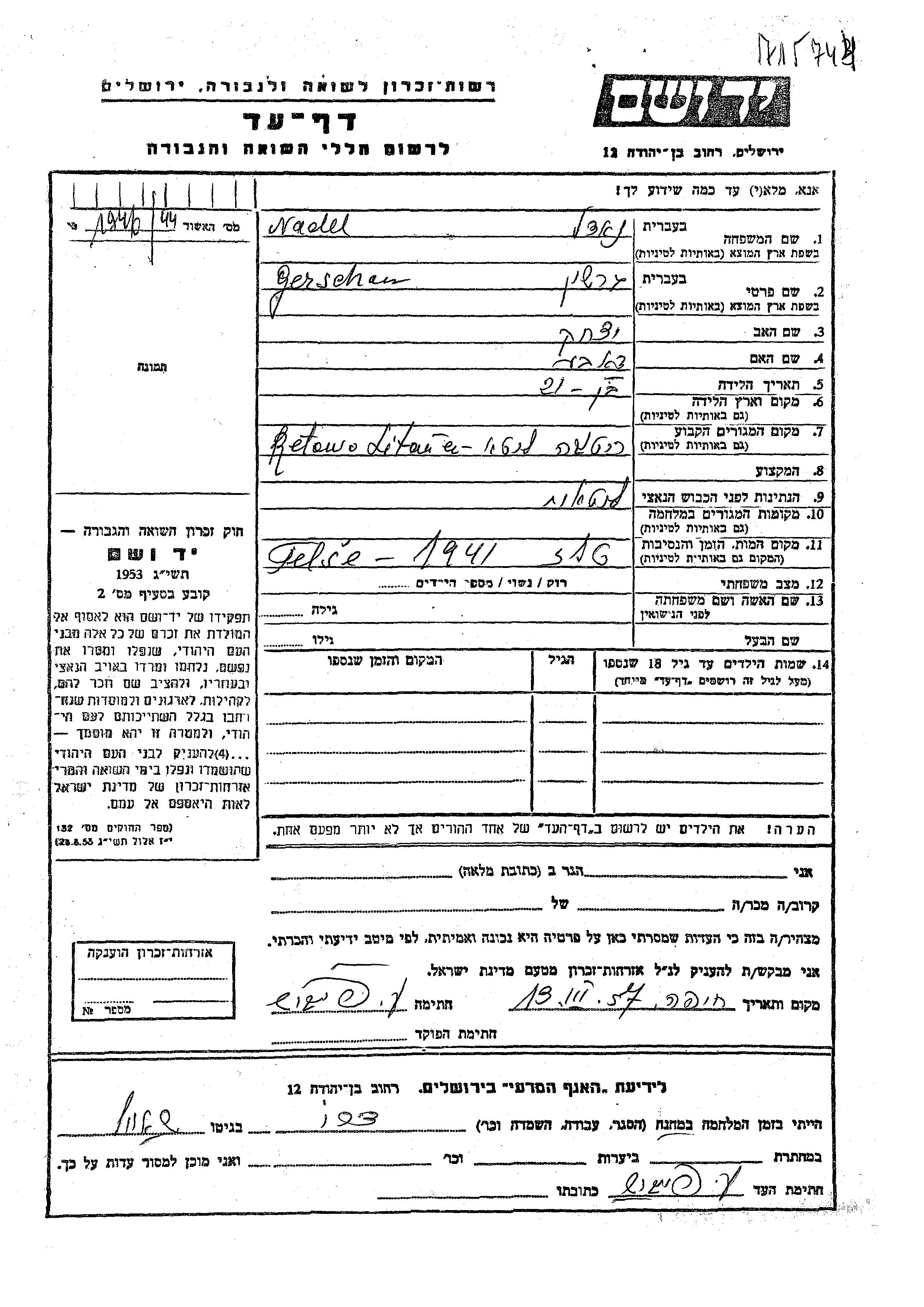 Yad Vashem - Pages of Testimony Names Memorial Collection