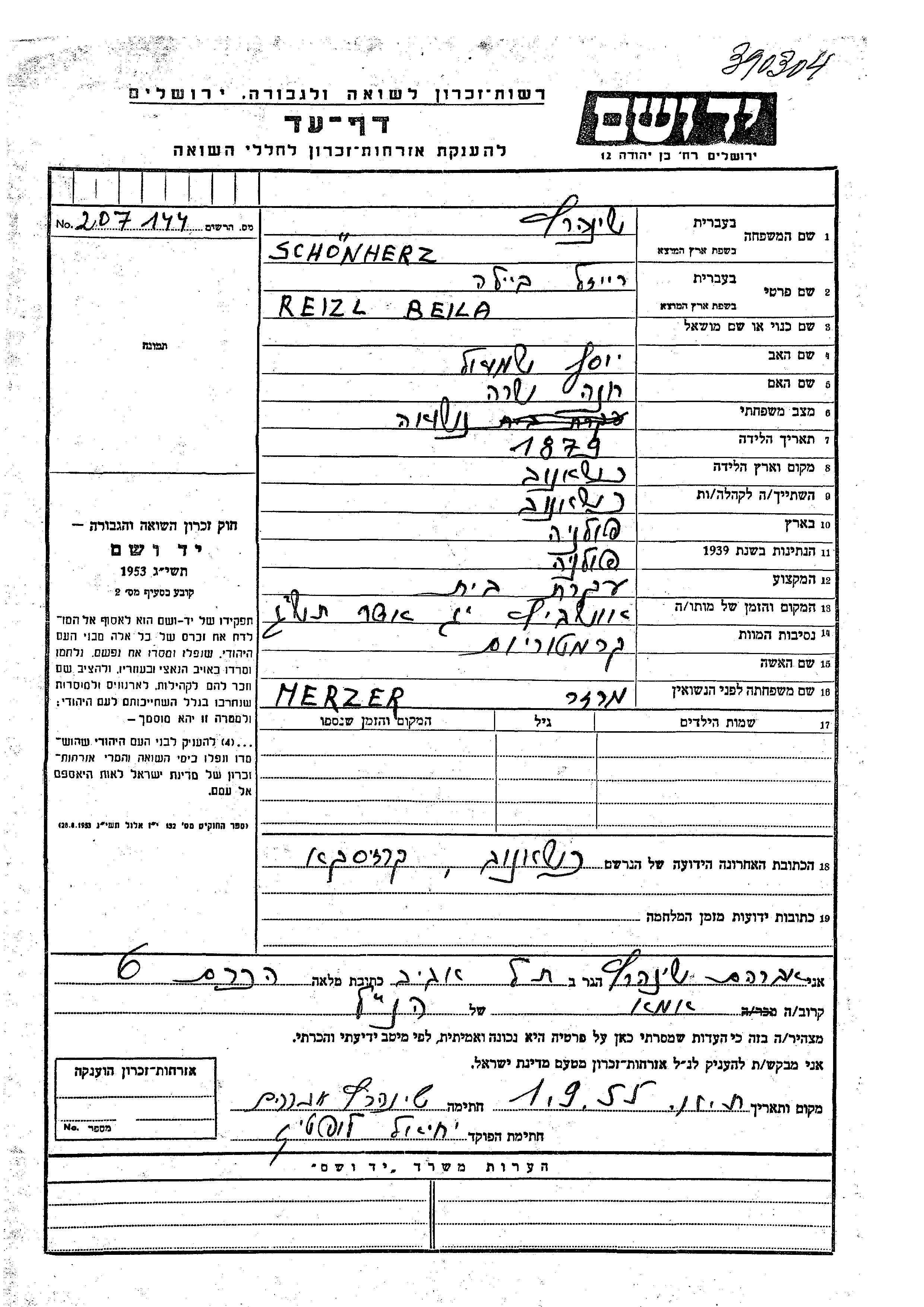 Reizl Beila Schoenherz née Merzer est née à Kreshanov, Pologne en 1879, fille de Yosef Shmuel et de Khana Sara. Elle était Femme au foyer et Mariée. Avant la seconde guerre mondiale elle vivait à Kreshanov, Pologne.