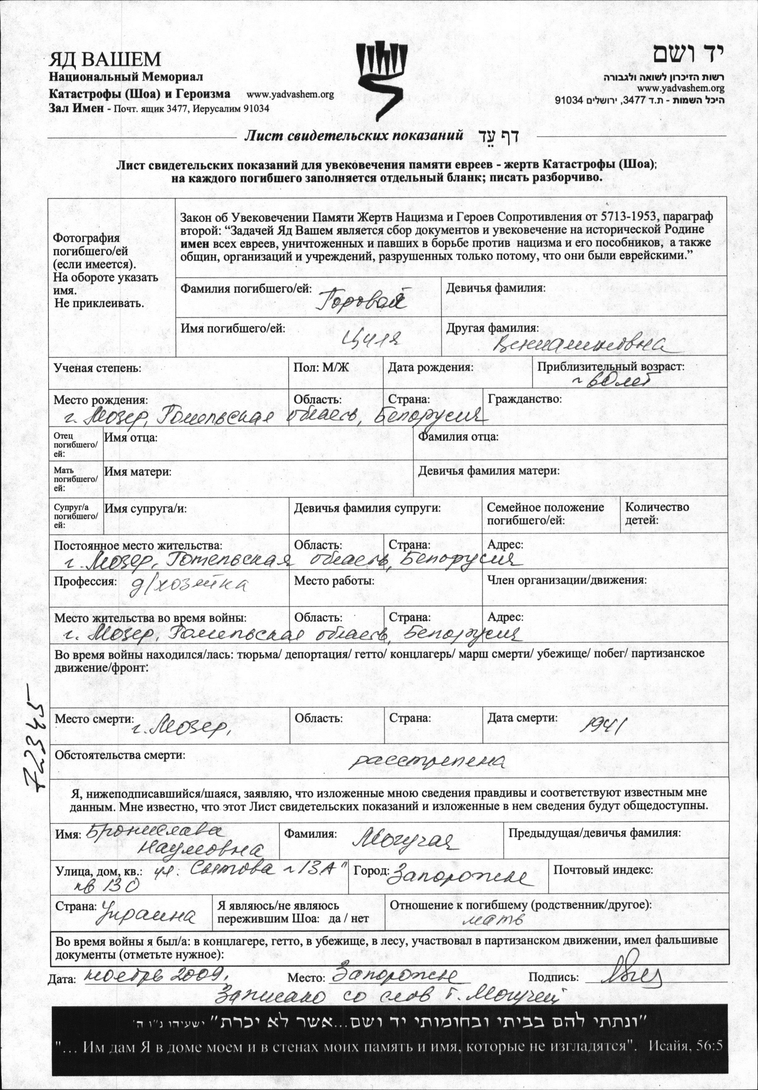Tzilya Gorovaya est née à Mozyr, Bélorussie (URSS), fille de Veniamin. Elle était Femme au foyer. Avant la seconde guerre mondiale elle vivait à Mozyr, Bélorussie (URSS). Pendant la guerre, elle était à Mozyr, Bélorussie (URSS).