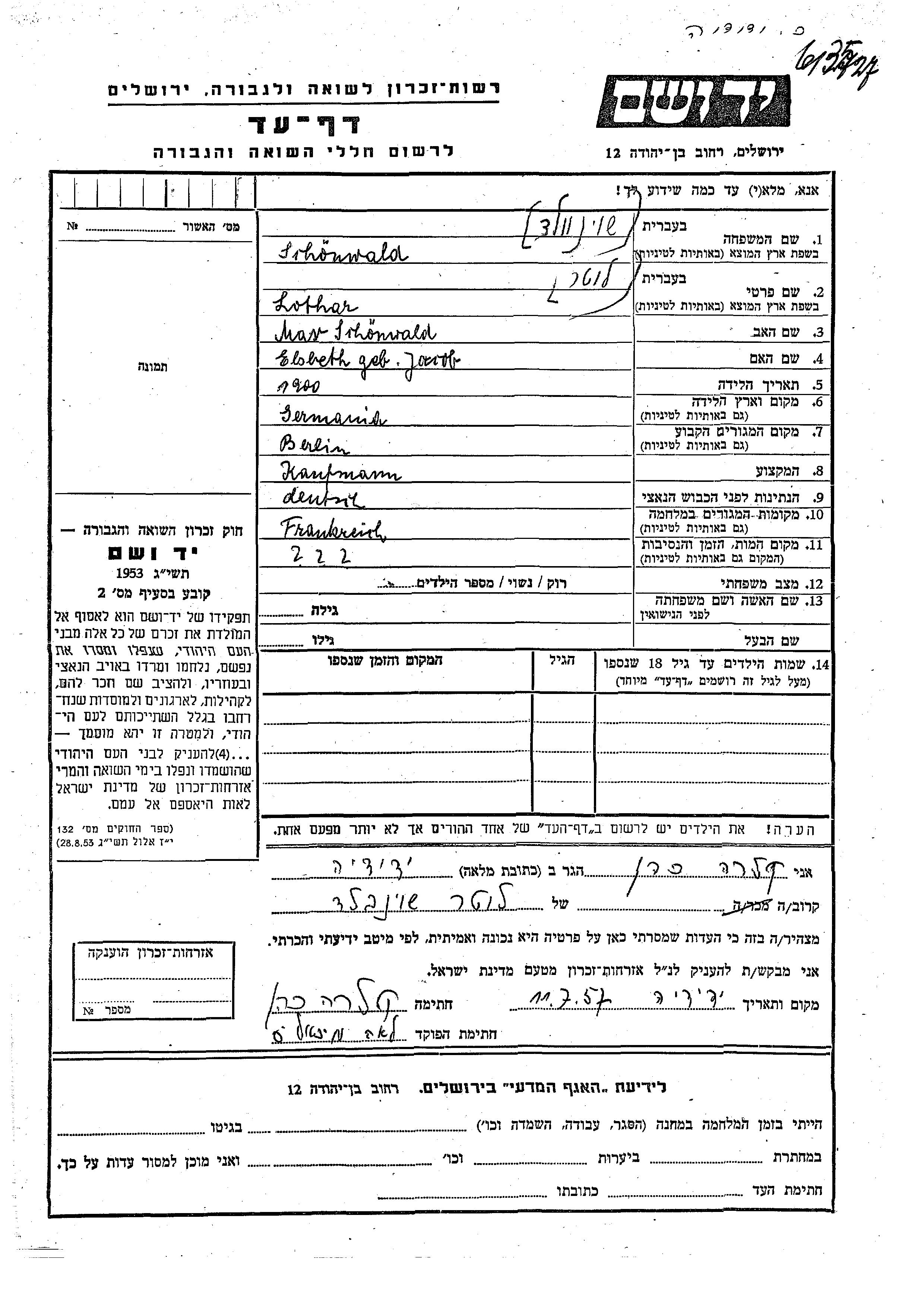 Lothar Schonwald est né à Allemagne en 1900, fils de Mar et de Elsbeth. Il était Commerçant/e. Avant la seconde guerre mondiale il vivait à Berlin, Allemagne. Au cours de la guerre, il était à France.