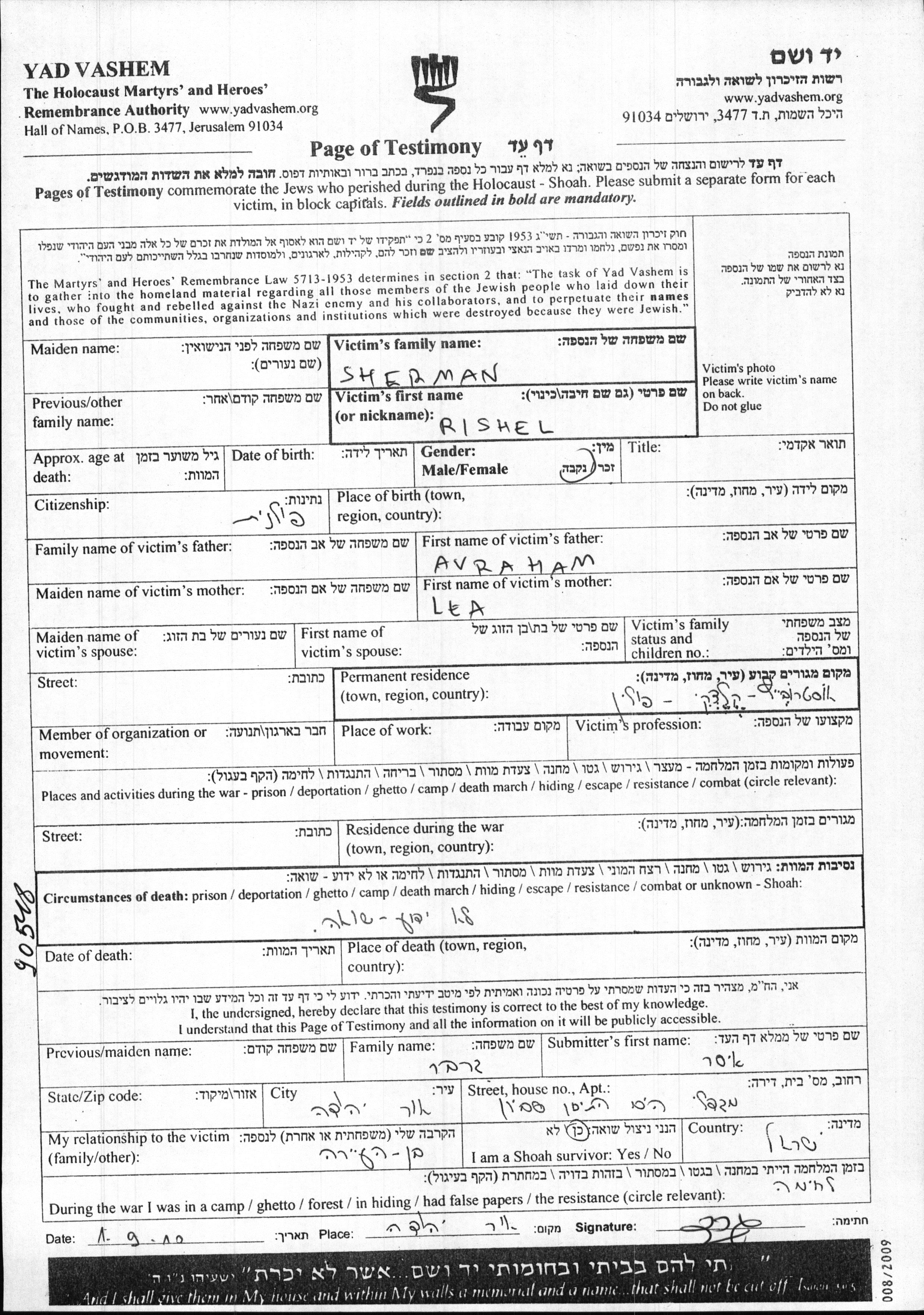 Sherman Rishel Ostrowiec, Pologne Feuille de témoignage
