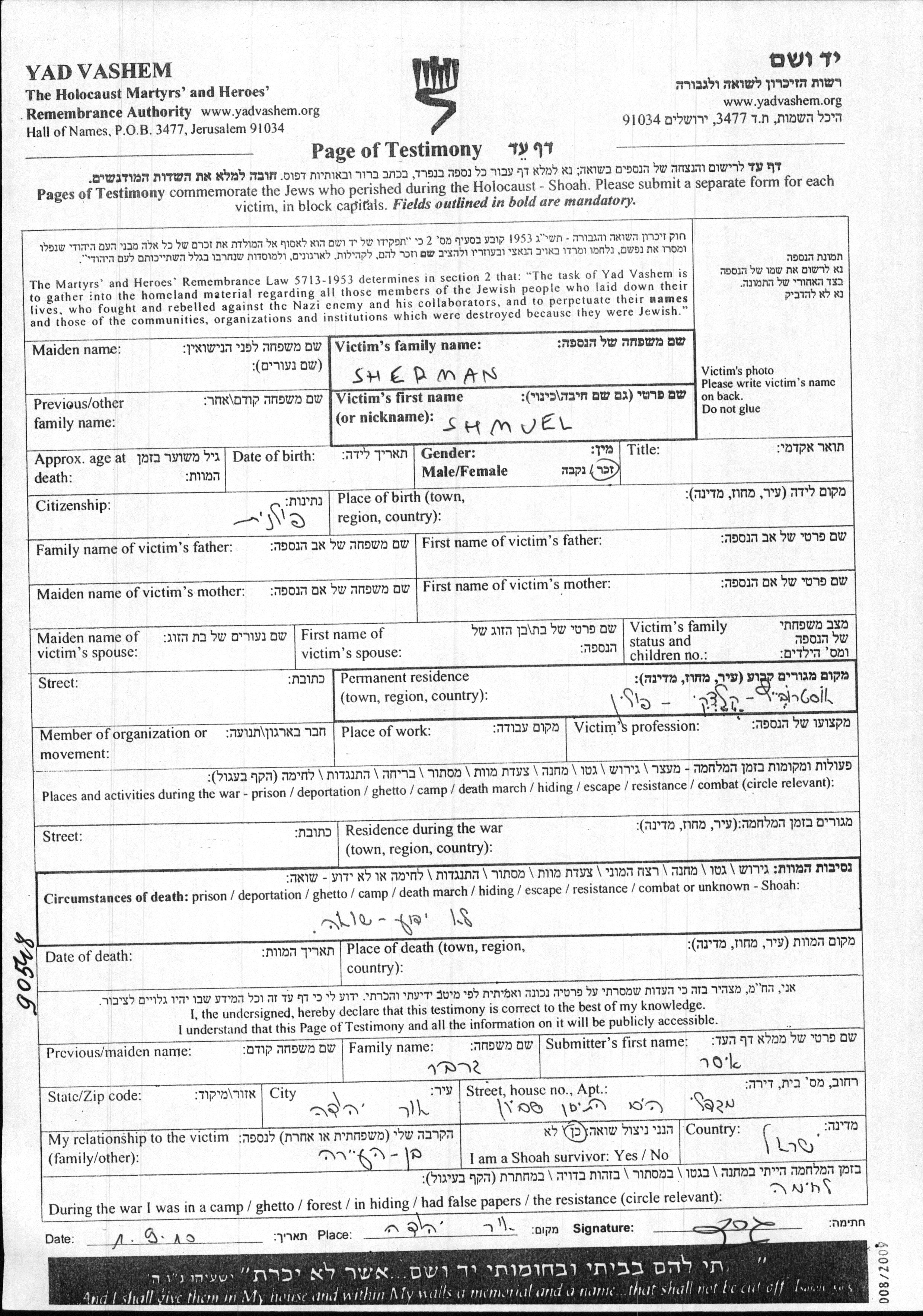 Sherman Shmuel Ostrowiec, Pologne Feuille de témoignage