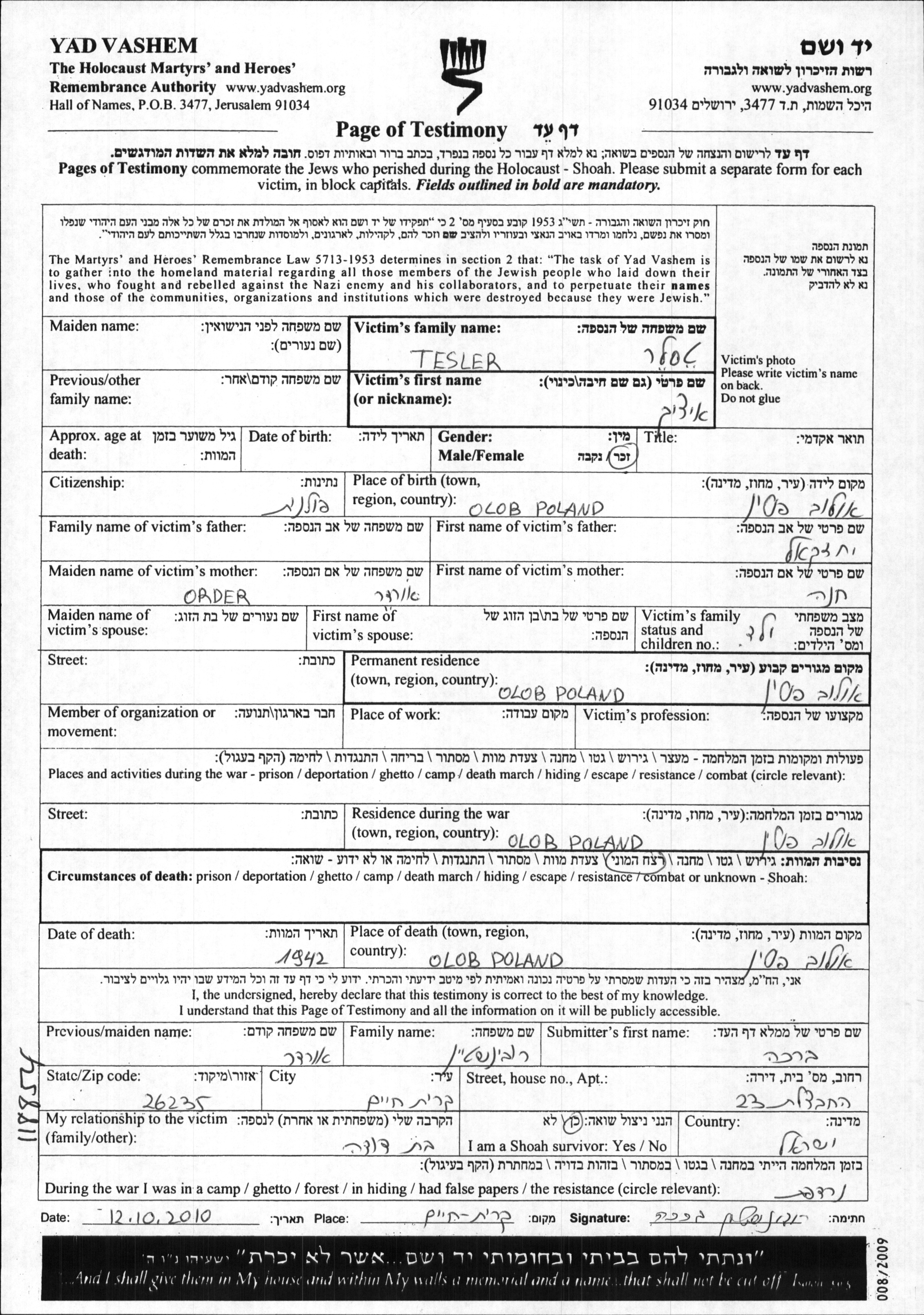 Tesler Itzik Ulow, Pologne Feuille de témoignage