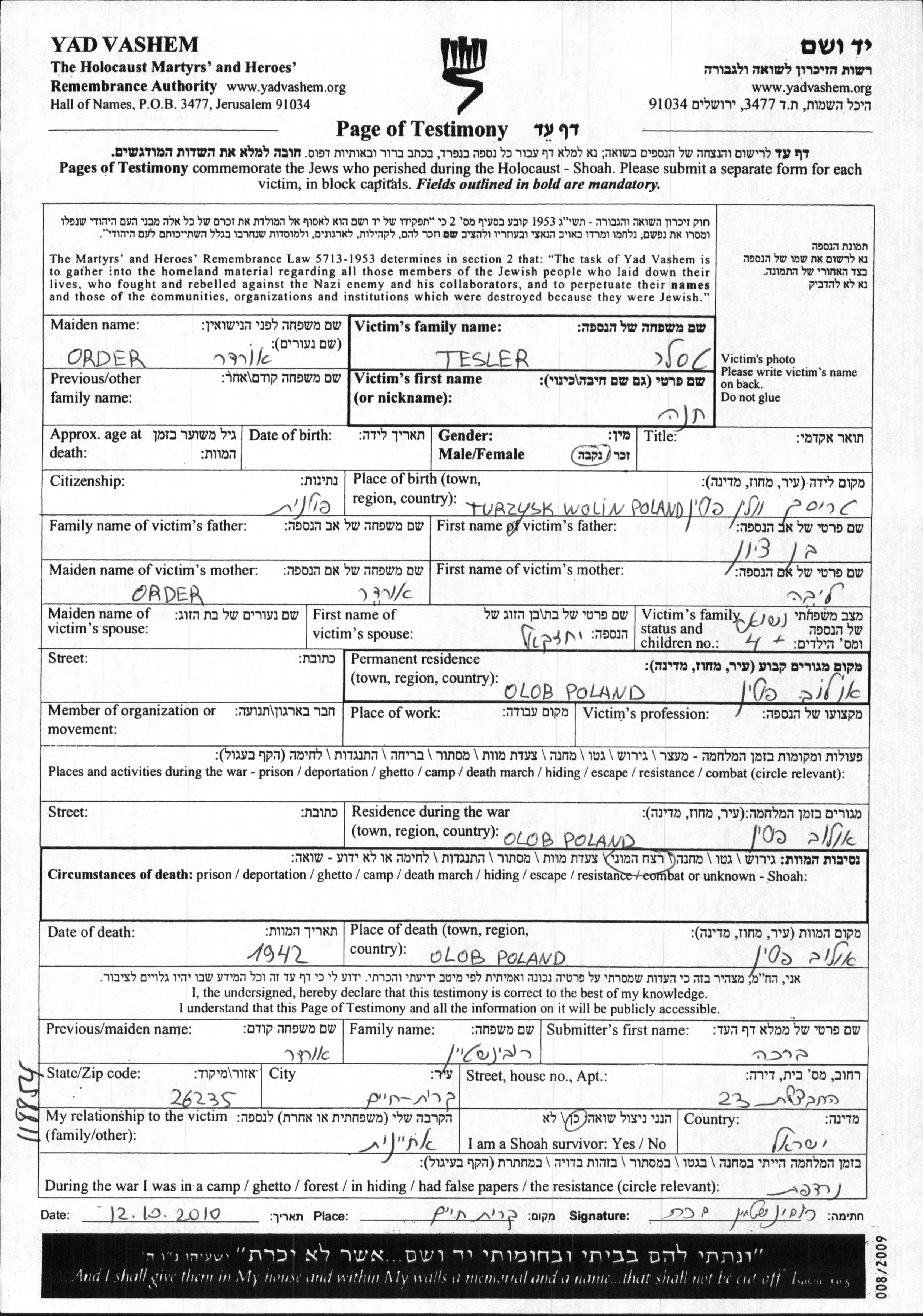 Chana Tesler née Order est née à Turzysk, Pologne, fille de Bentzion et de Liba. Elle était Mariée à Yekhezkel. Avant la seconde guerre mondiale elle vivait à Hołoby, Pologne. Pendant la guerre, elle était à Hołoby, Pologne.