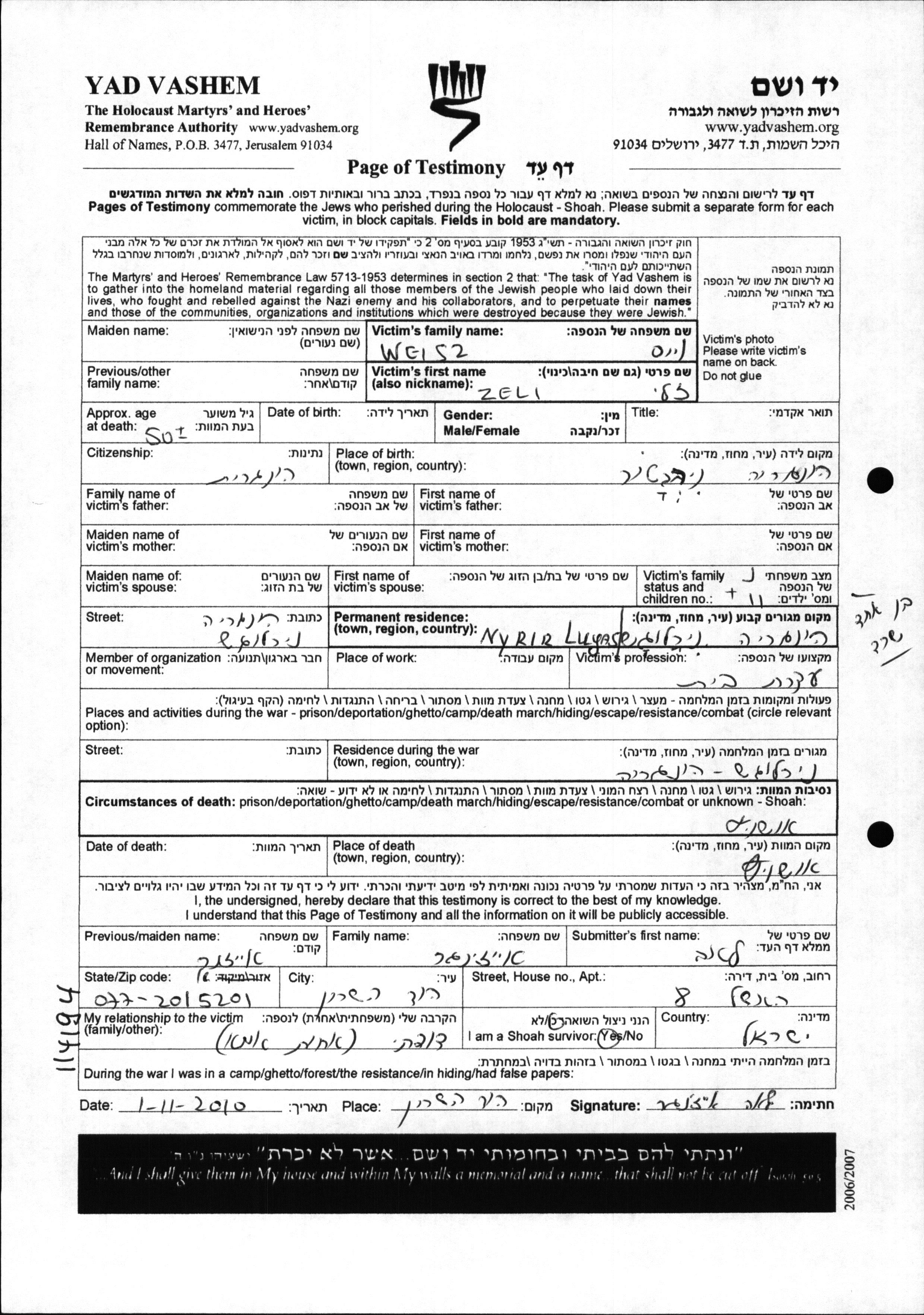 Weisz Zeli Zali Nyirlugos, Hongrie Feuille de témoignage