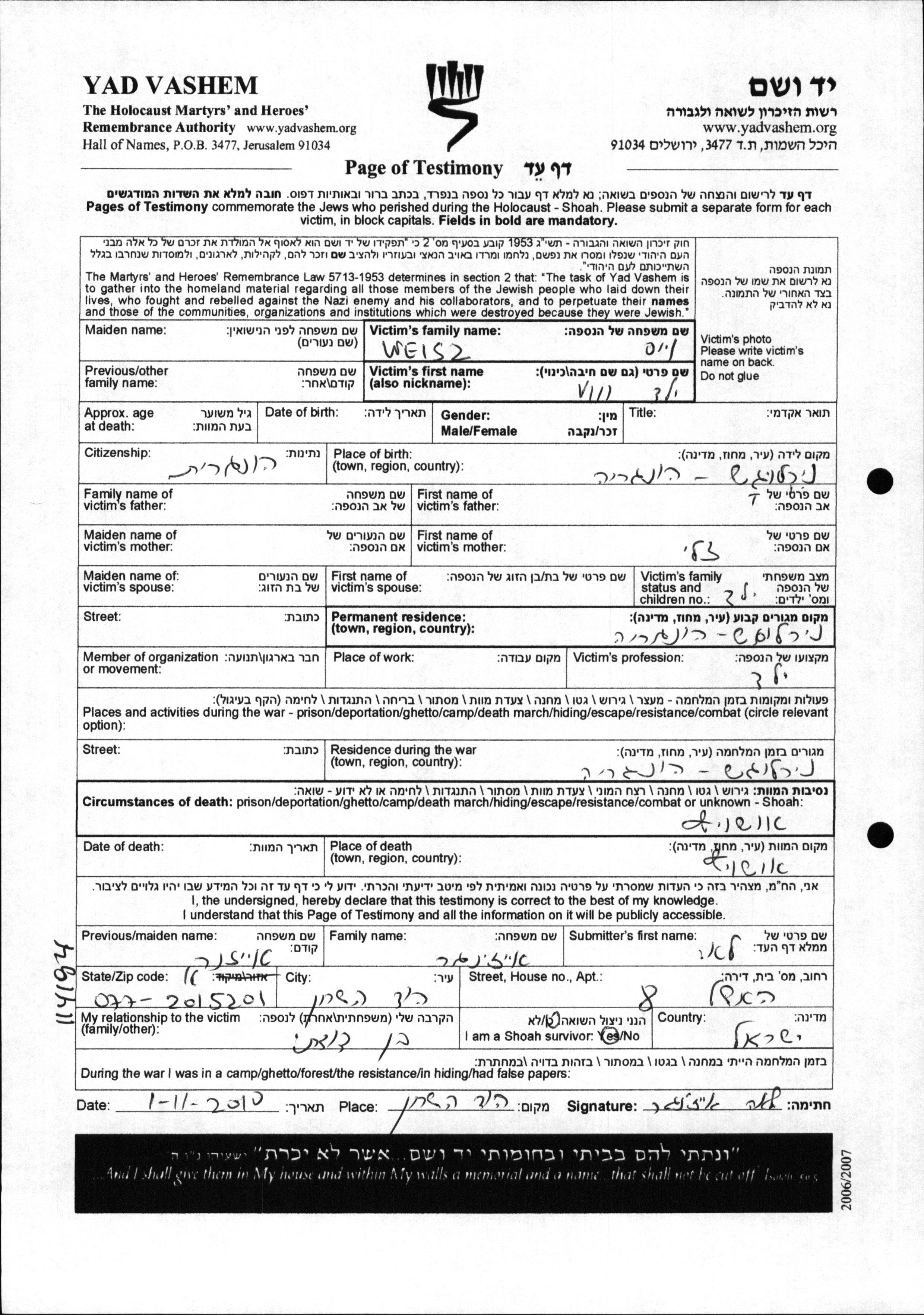 Weisz prénom inconnu Nyirlugos, Hongrie Feuille de témoignage