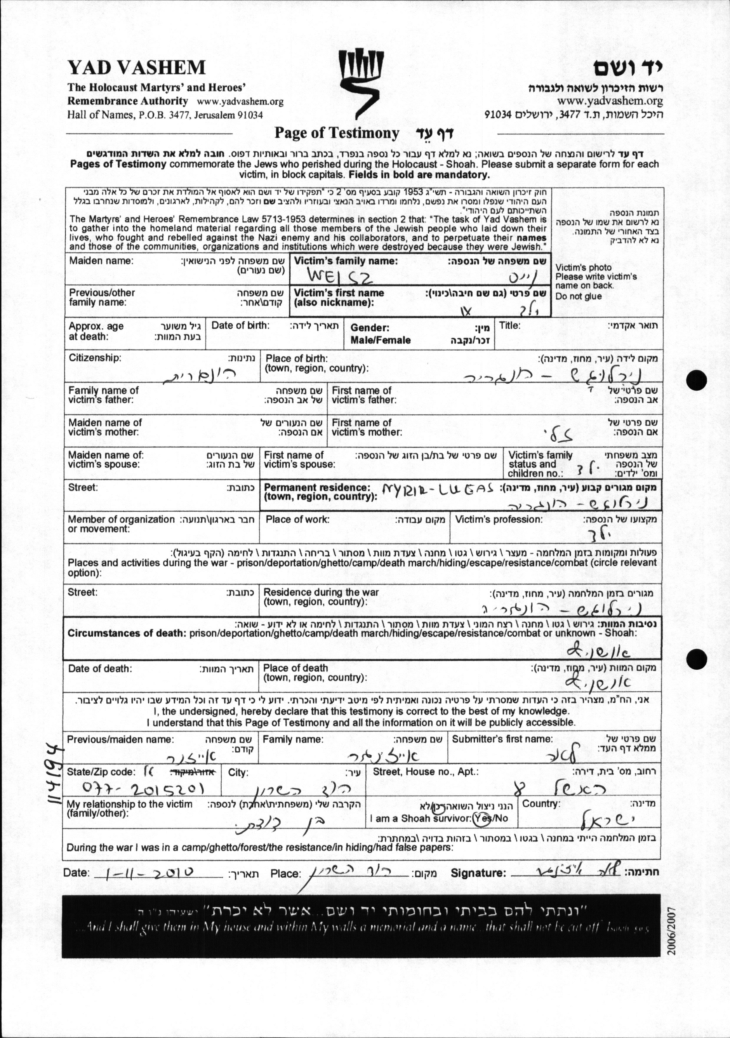 Weisz prénom inconnu Nyirlugos, Hongrie Feuille de témoignage