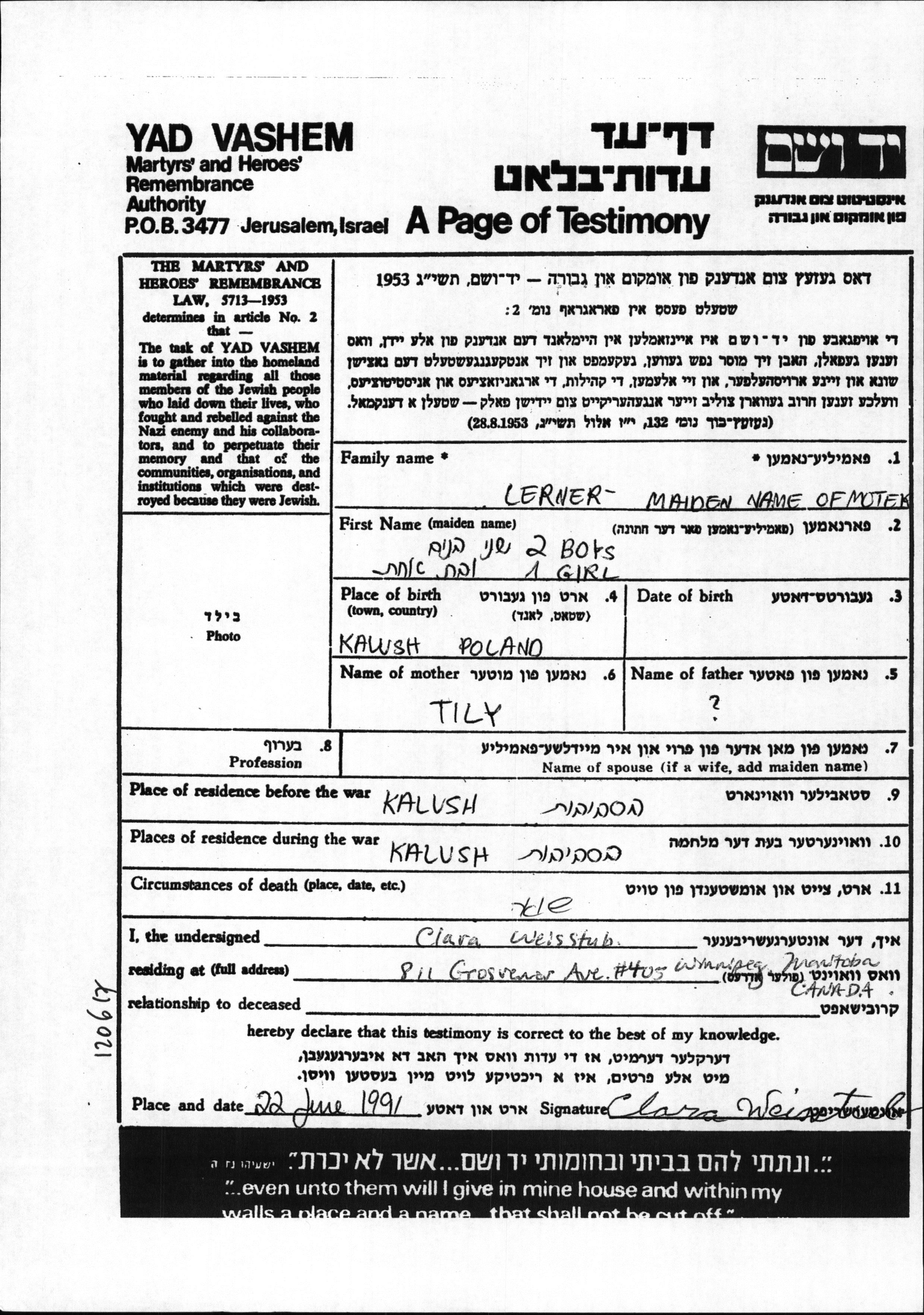 nom inconnu prénom inconnu Kalusz, Pologne Feuille de témoignage