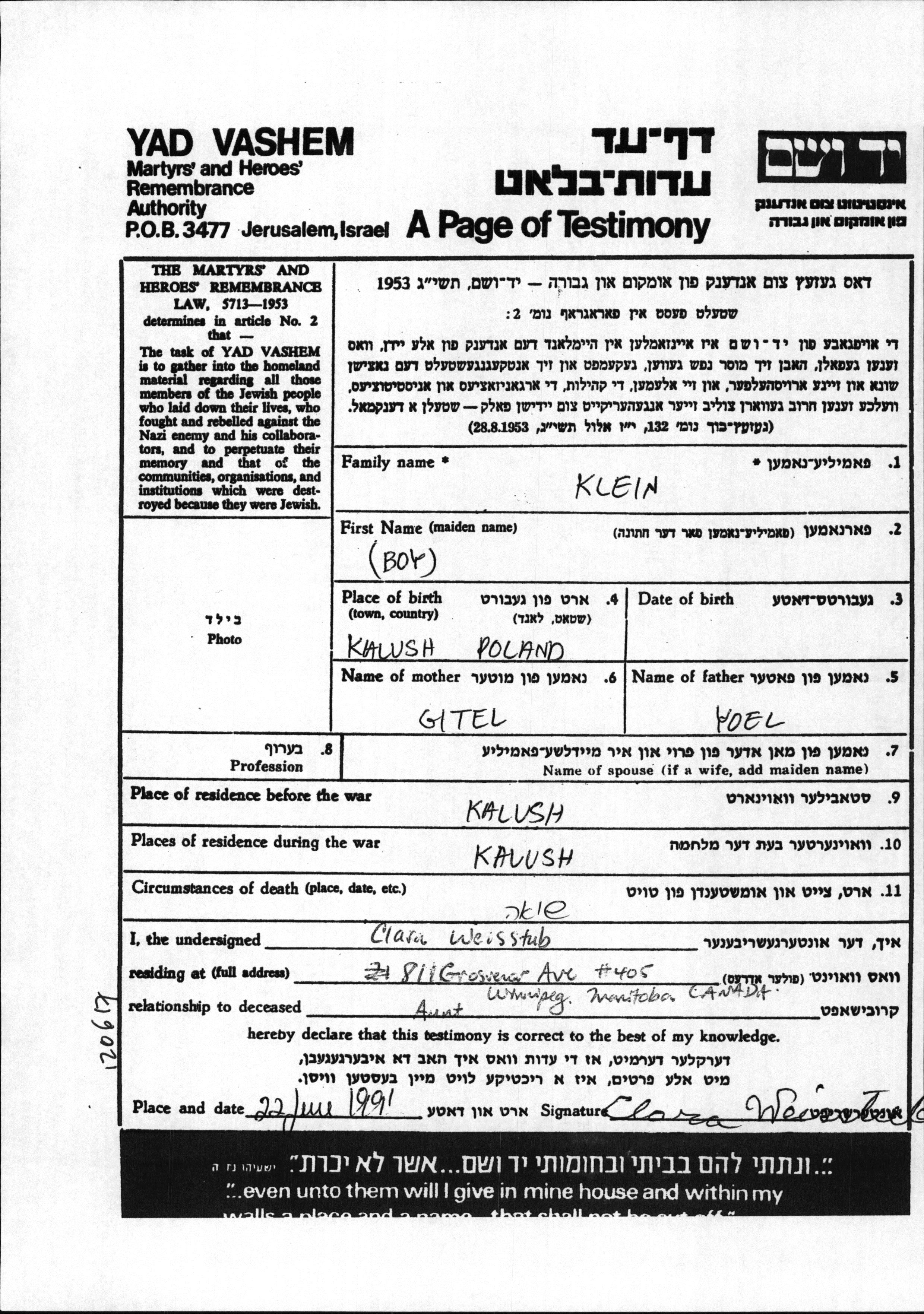 Klein prénom inconnu Kalush, Pologne Feuille de témoignage