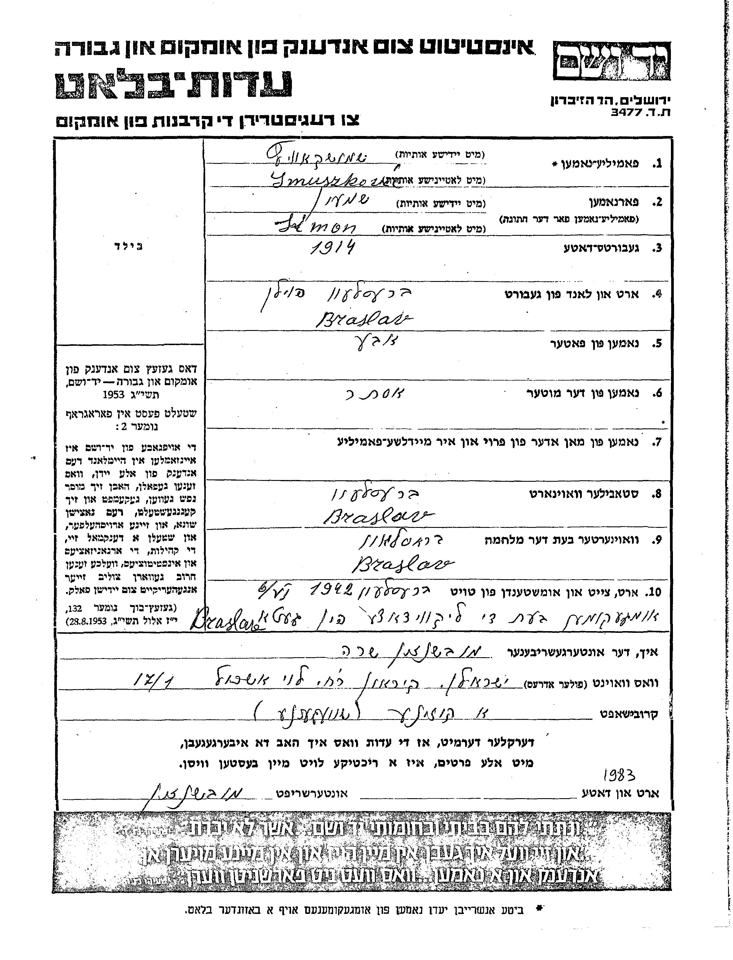 Smuszkowicz Saimon 1914 Braslaw, Pologne Feuille de témoignage