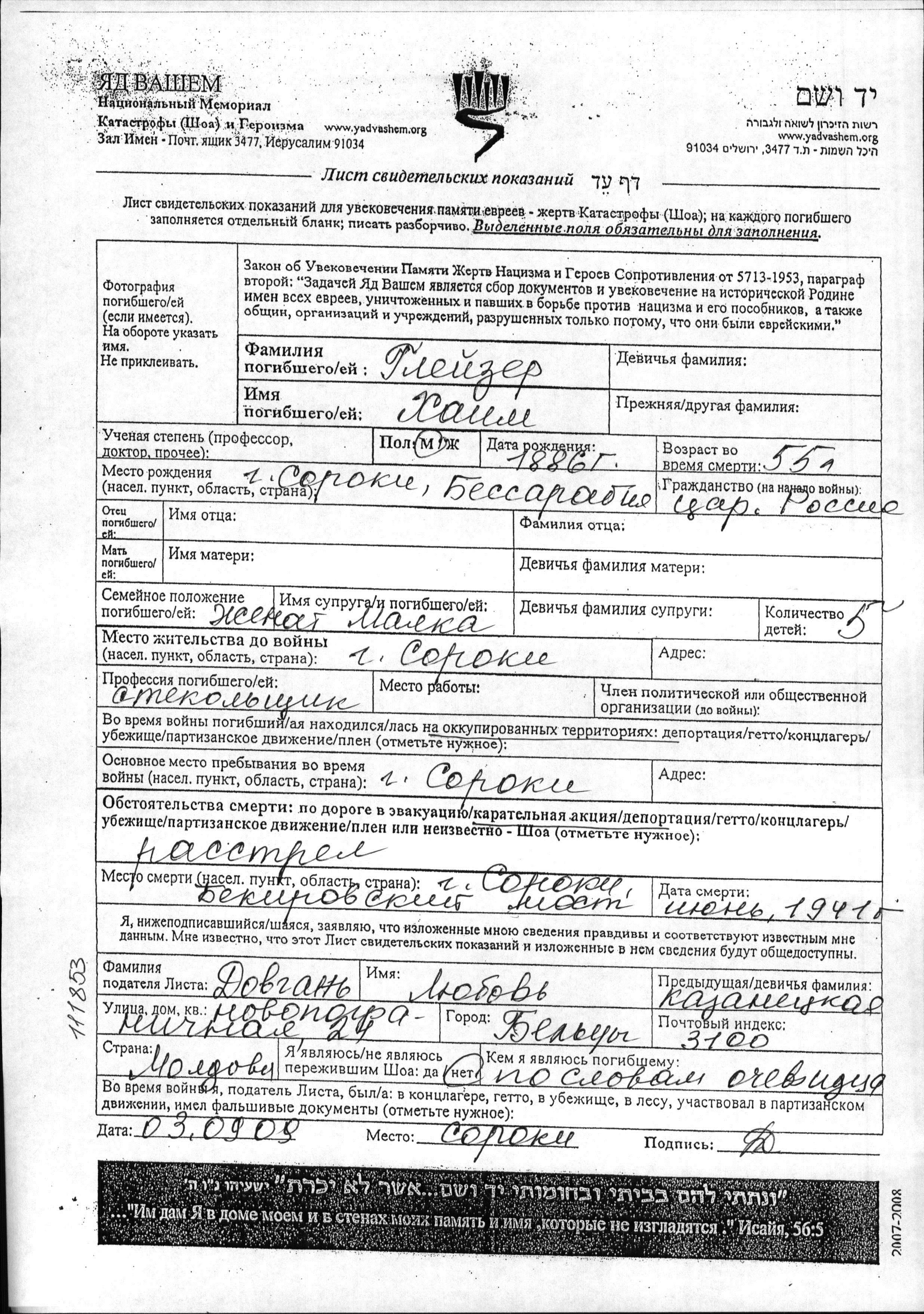 Yad Vashem - Pages of Testimony Names Memorial Collection