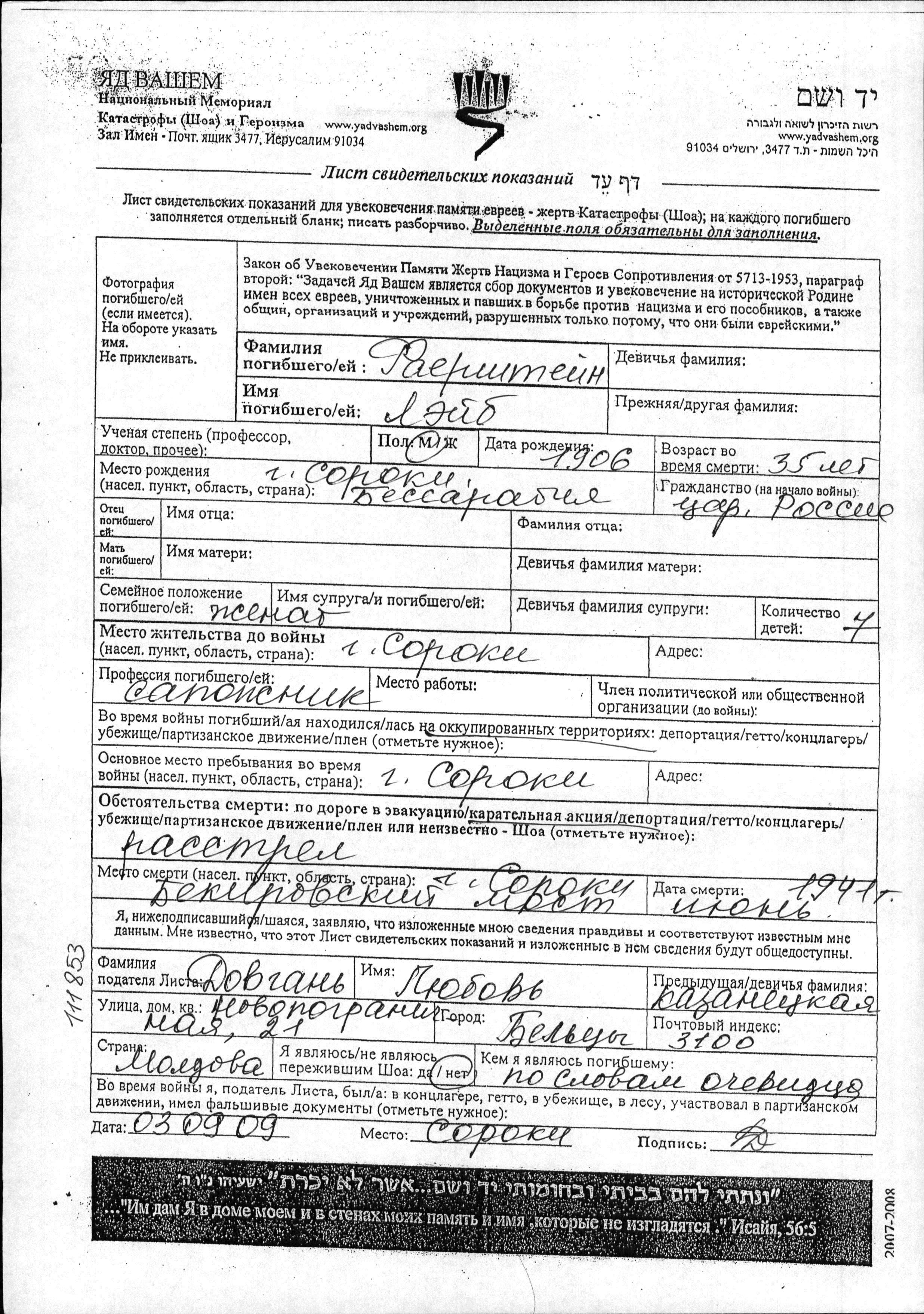 Fayershteyn Leyb 1906 Soroka, Roumanie Feuille de témoignage