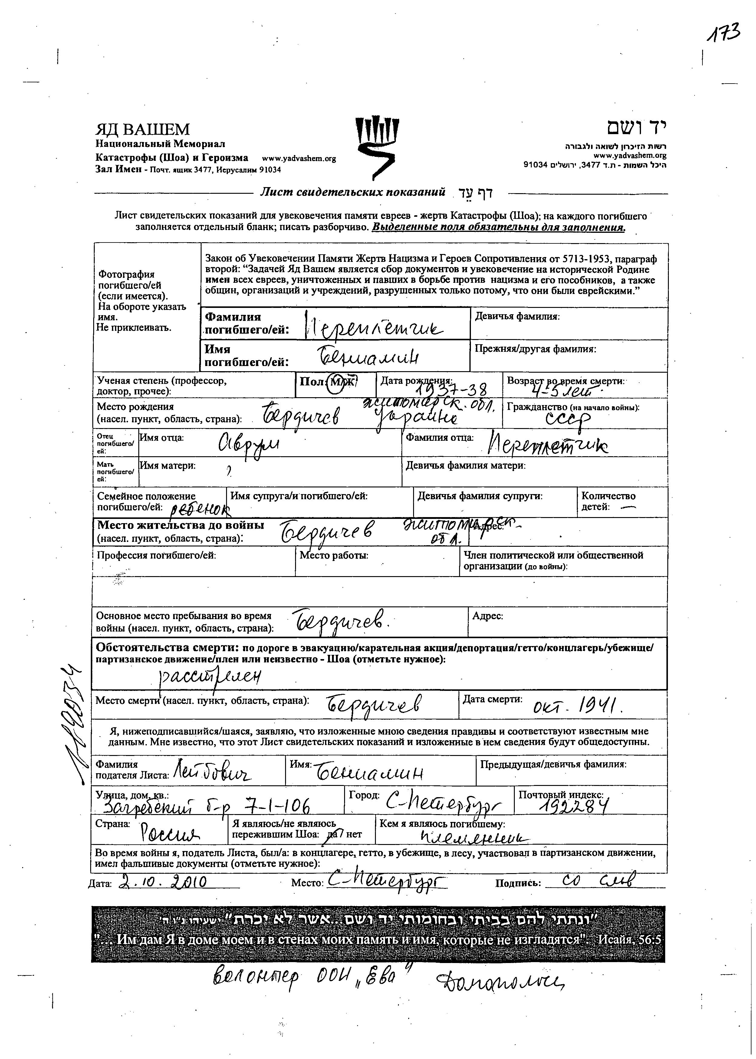 Pereplyotchik Beniamin 1937 Berdichev, Ukraine (URSS) Feuille de témoignage