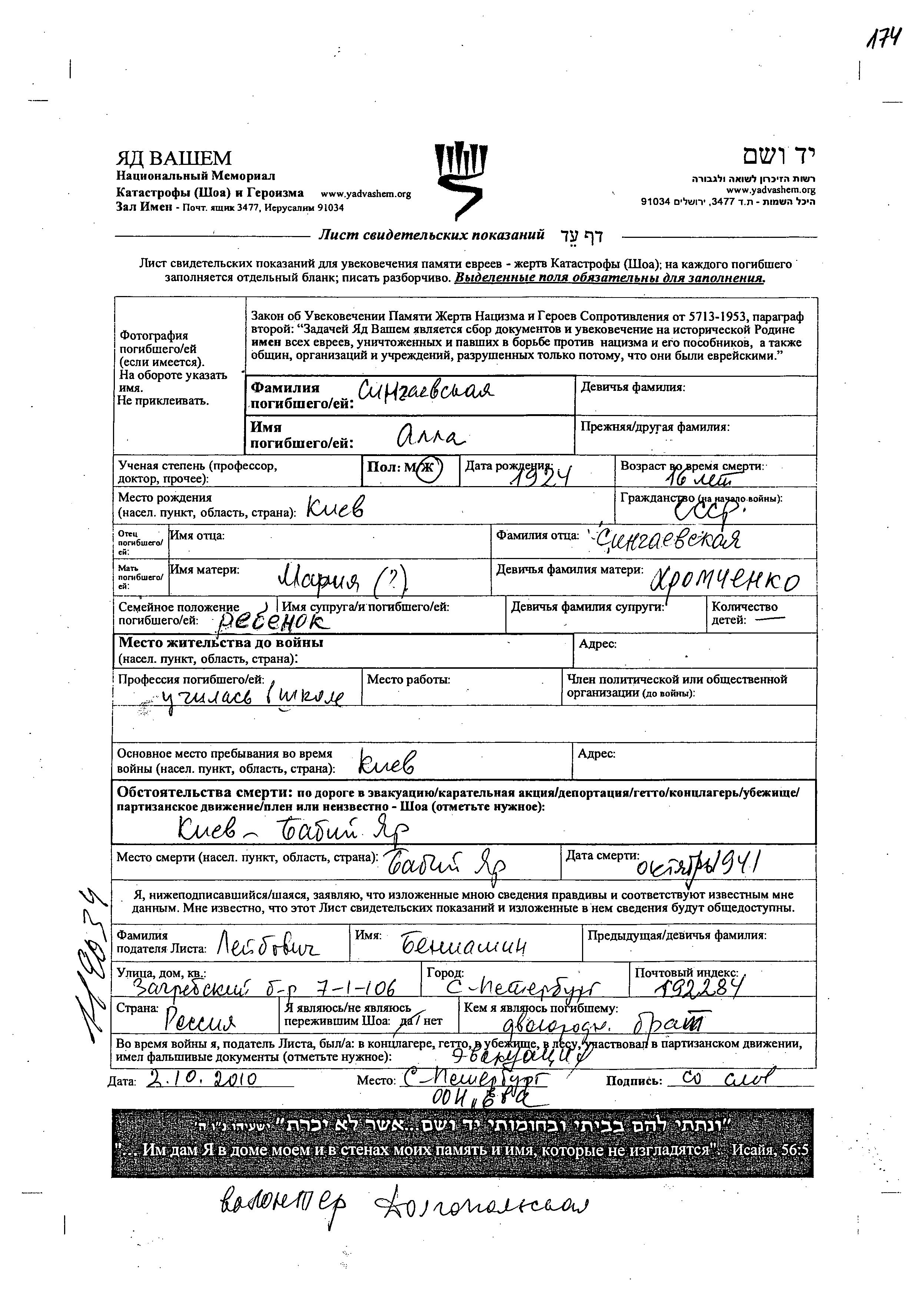 Singayevskaya Alla 1924 Kiev, Ukraine (URSS) Feuille de témoignage
