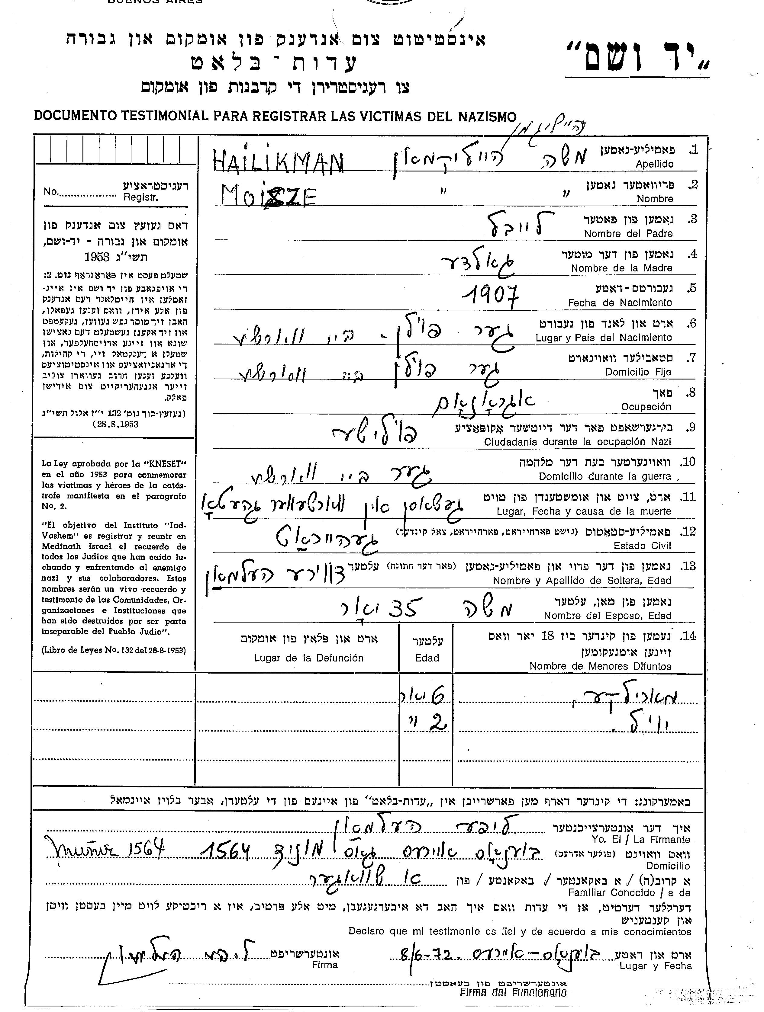 Hailikman Moisze 1907 Ger, Feuille de témoignage