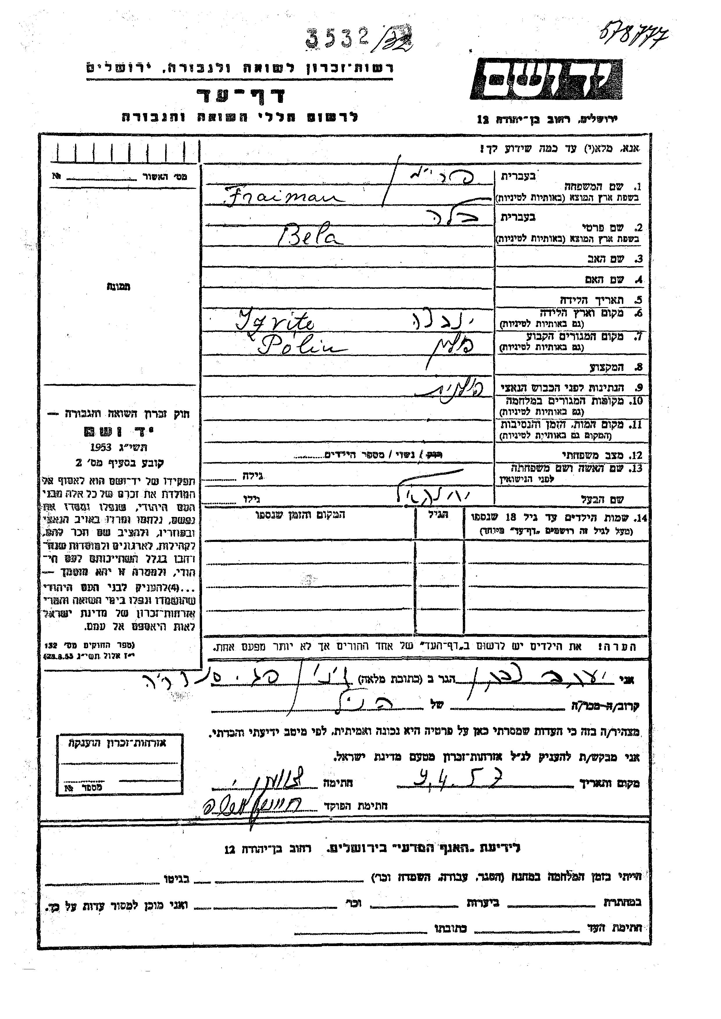Bela Fraiman est née à Izbica, Pologne. Elle était Mariée à Yekhezkel. Avant la seconde guerre mondiale elle vivait à Pologne.