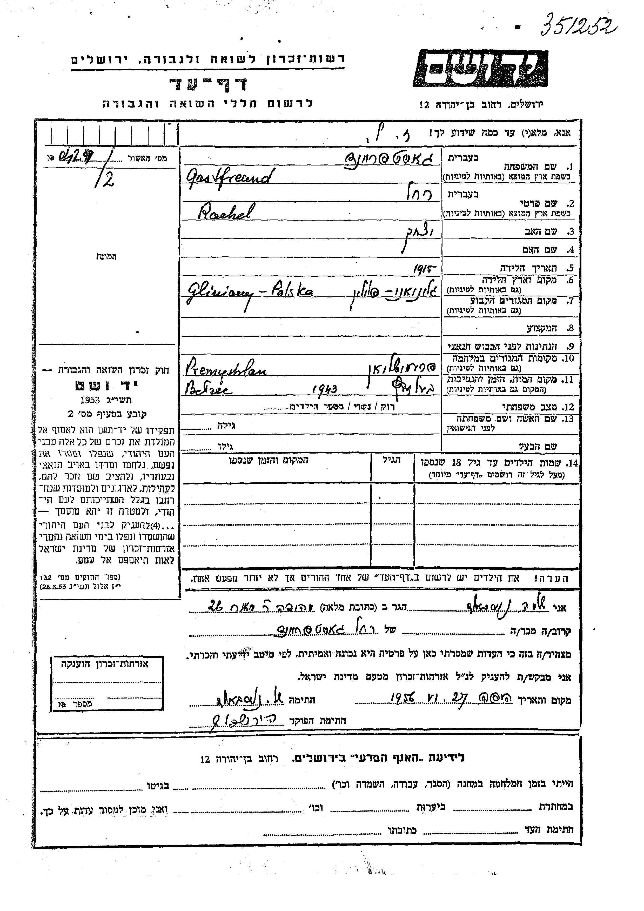 Gastfreind Rachel 1915 endroit inconnu, Feuille de témoignage