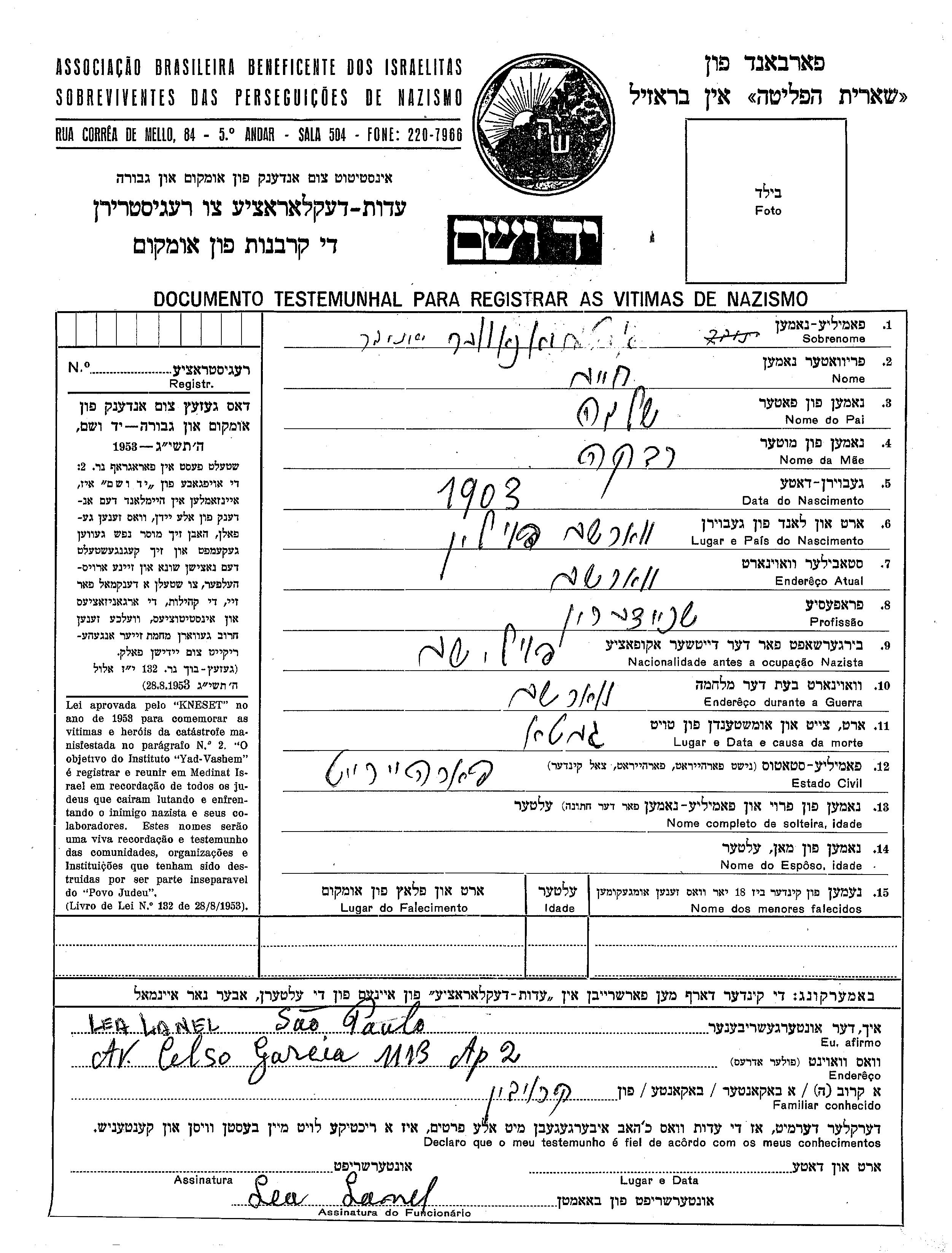 Ianover Khaim 1903 Warszawa, Pologne Feuille de témoignage