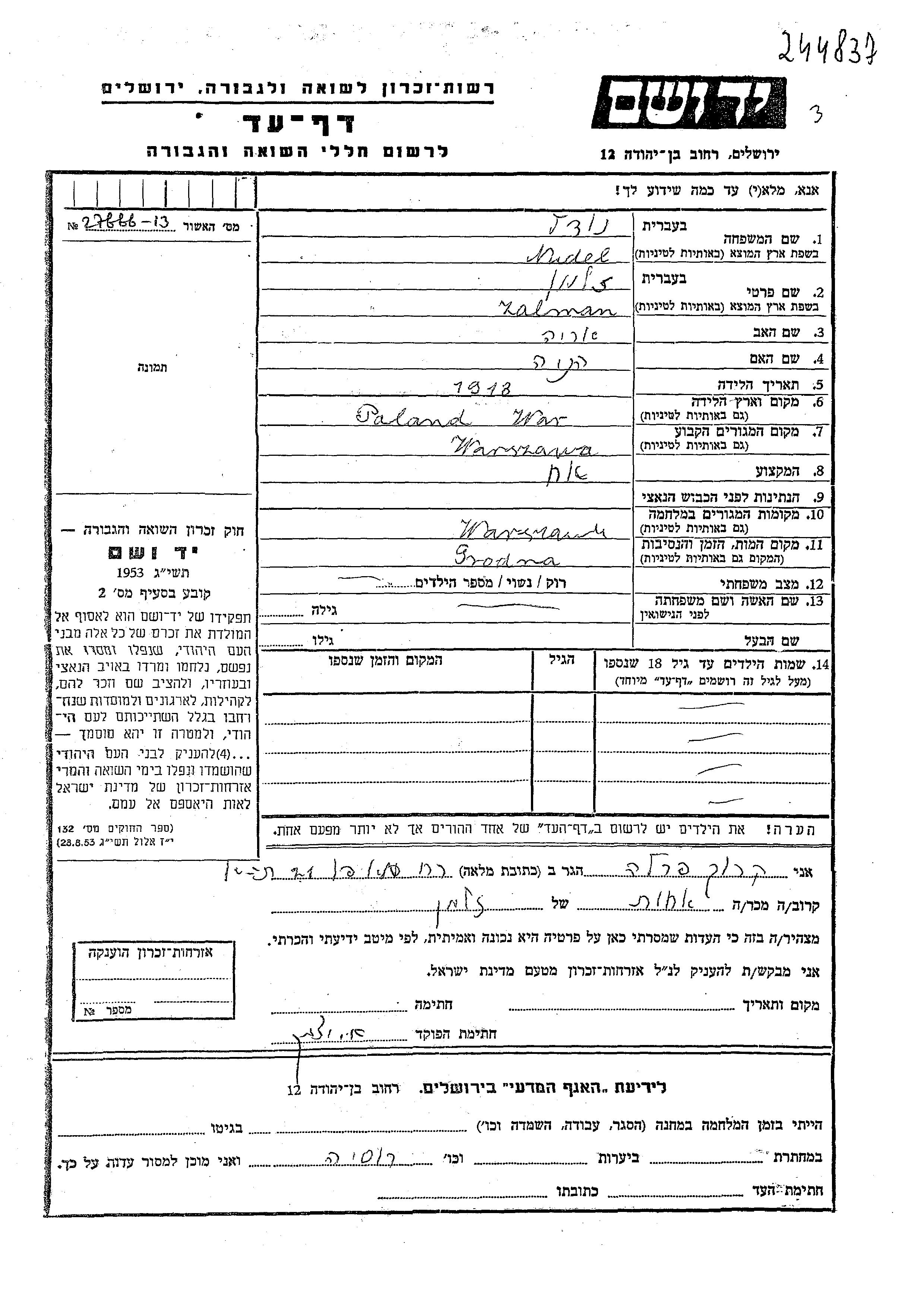 Nudel Zalman 1918 Warsaw, Pologne Feuille de témoignage