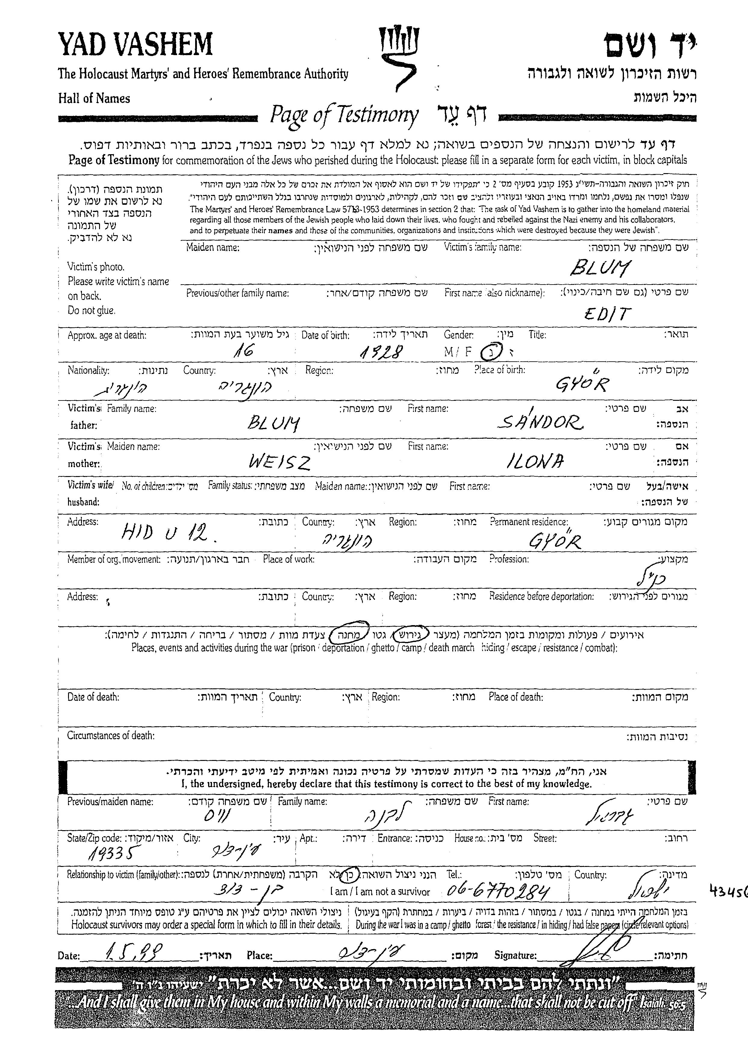 Yad Vashem - Pages of Testimony Names Memorial Collection