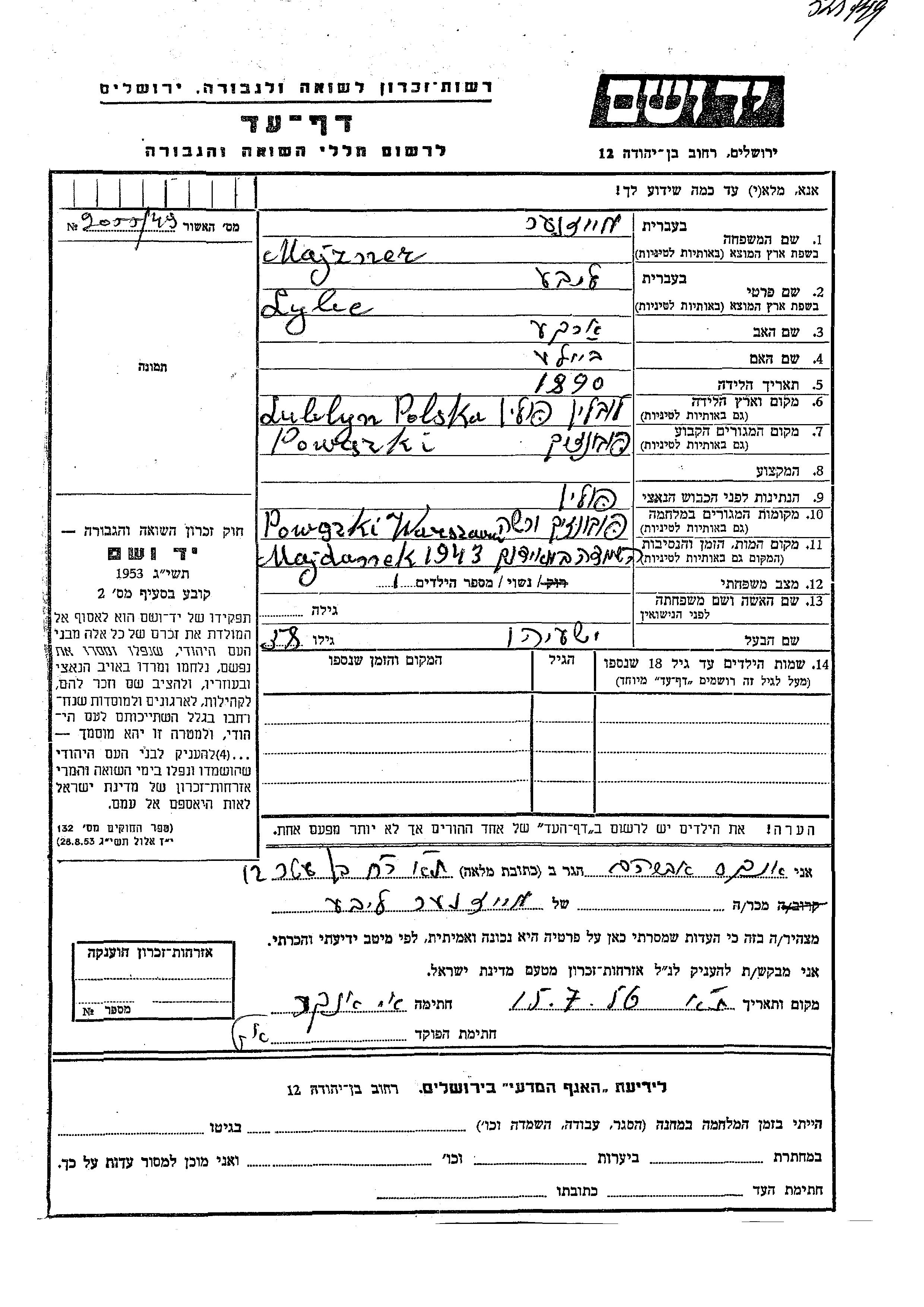 Lybe Majzner est née à Lublin, Pologne en 1890, fille de Aharon et de Beile. Elle était Mariée à Yeshayahu. Avant la seconde guerre mondiale elle vivait à Powonski, Pologne. Pendant la guerre, elle était à Powonski, Pologne.
