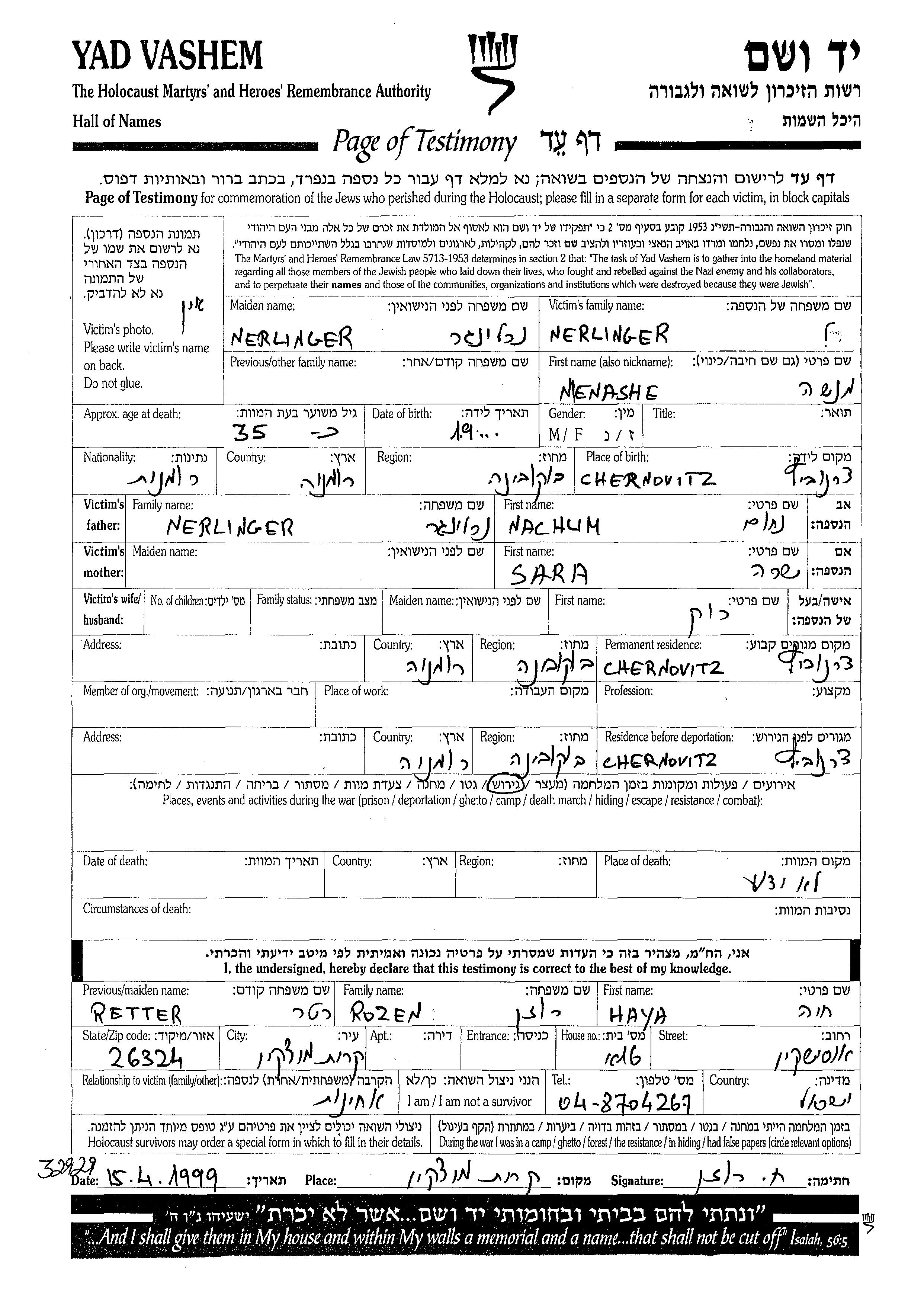 Nerlinger Menashe Czernowitz, Roumanie Feuille de témoignage