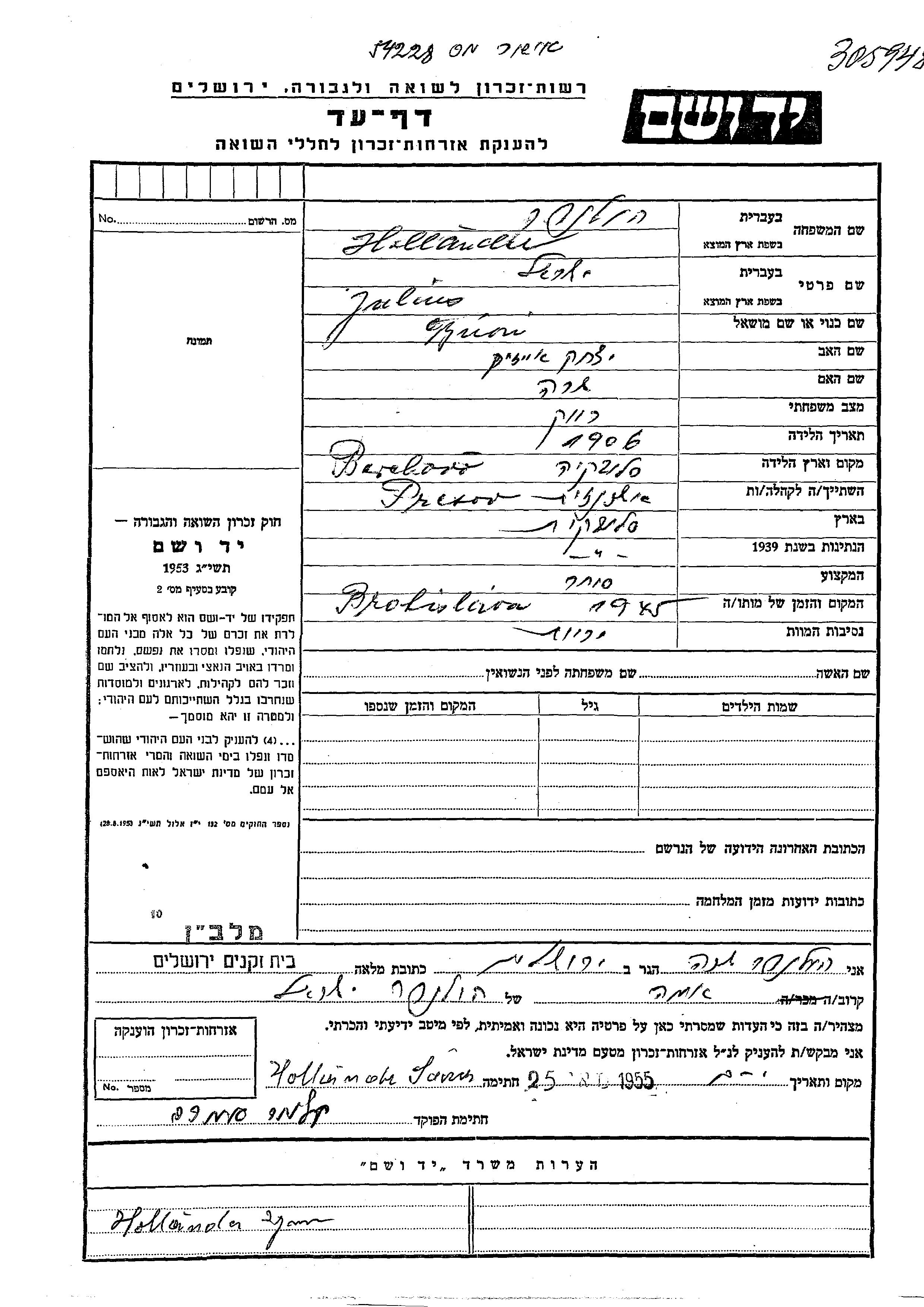 Hollander Julius Gyuri Yisrael 1906 Presov, Tchécoslovaquie Feuille de témoignage