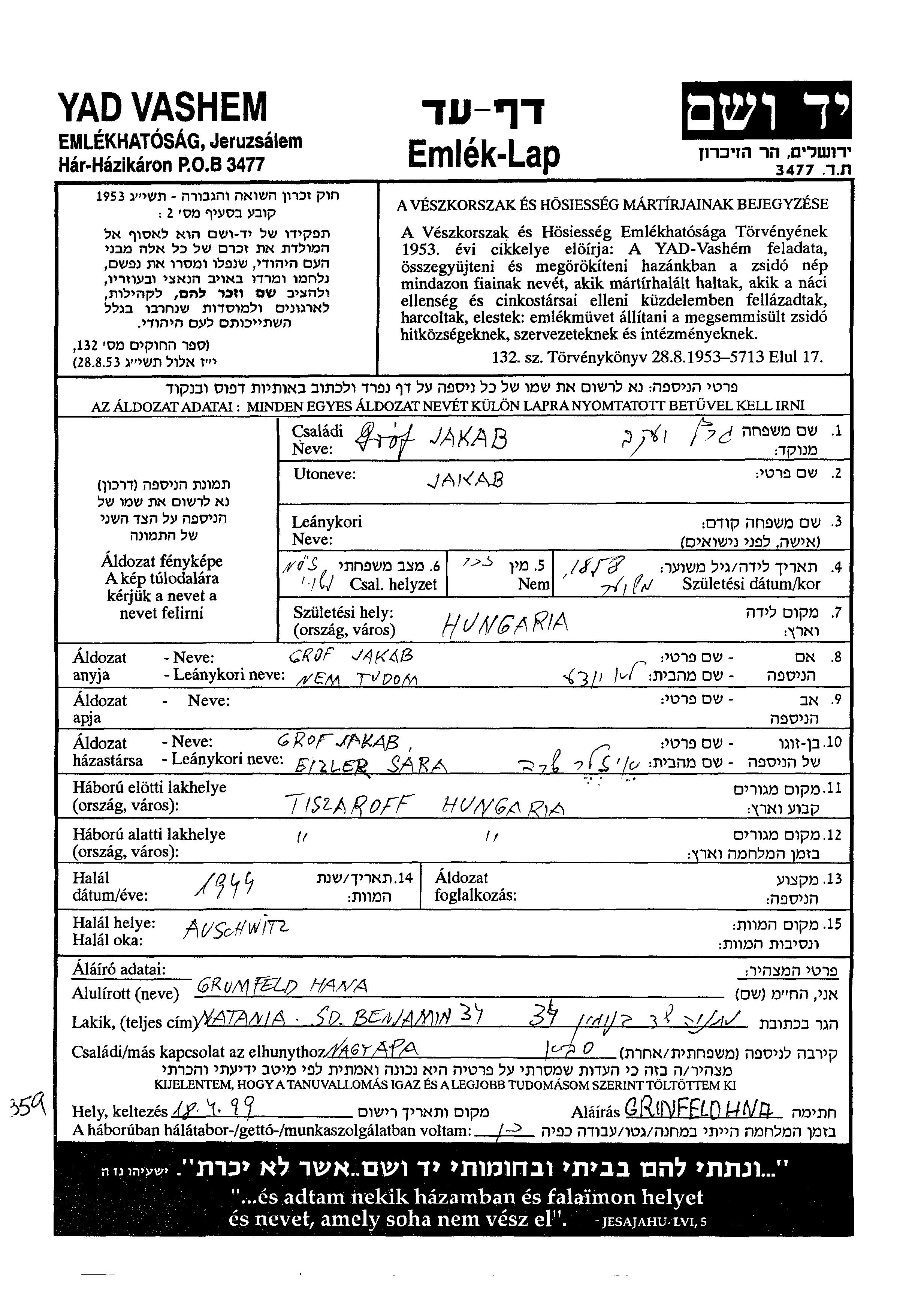 Jakab a été assassiné pendant la Shoah. Lieu de la mort: Auschwitz, Pologne en 1944.