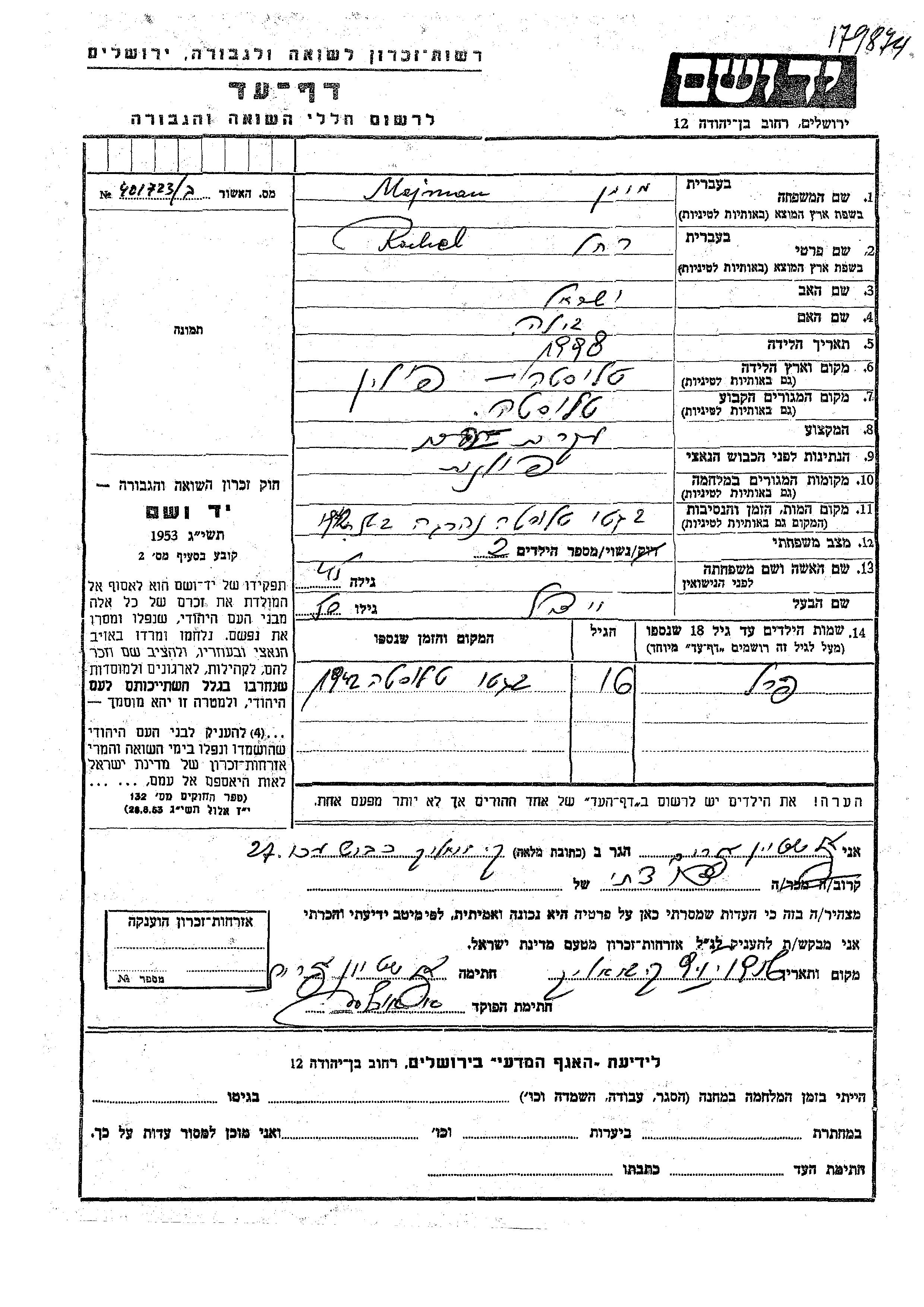 Mejman Miman Rachel 1898 Tluste, Pologne Feuille de témoignage