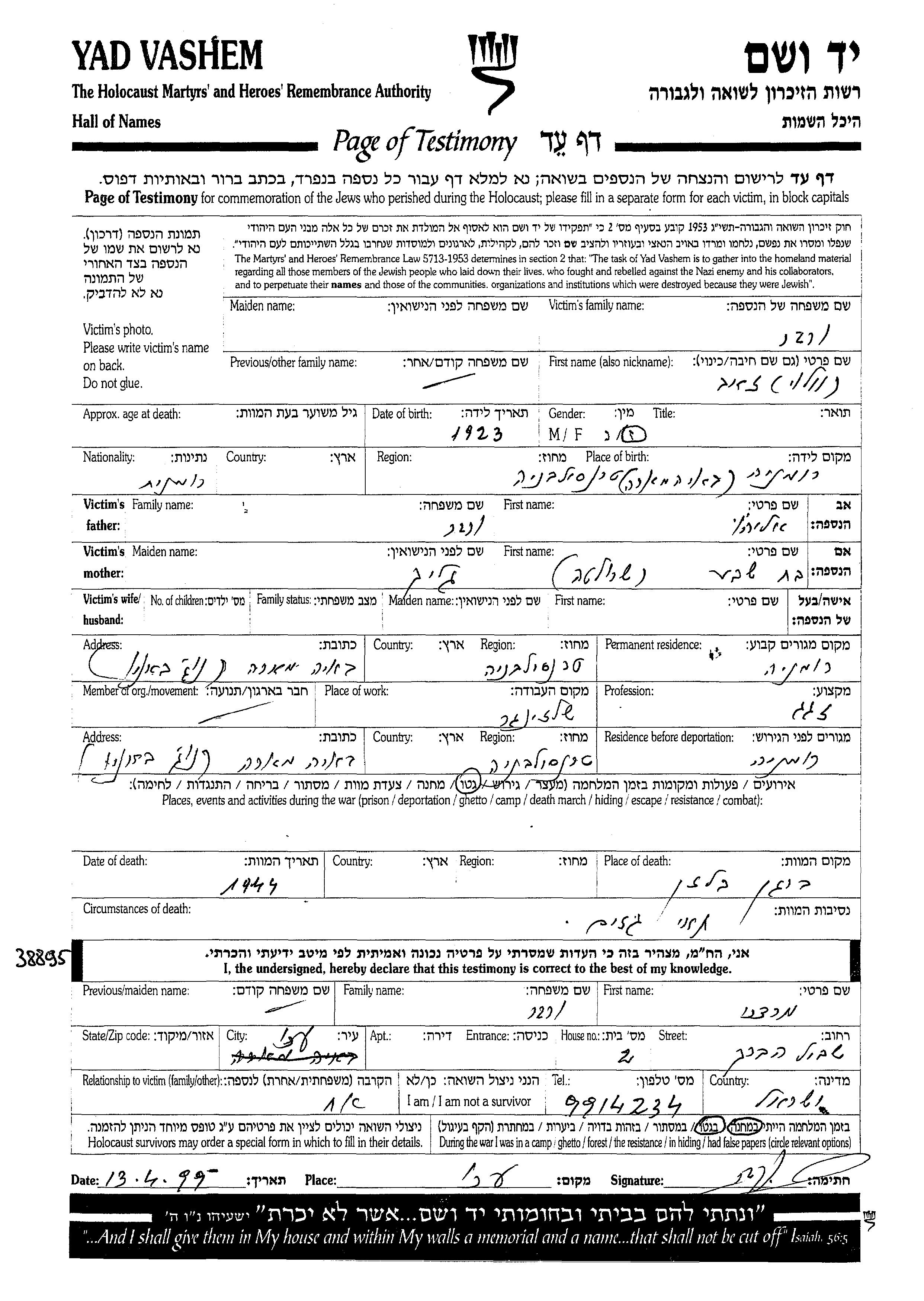 Yad Vashem - Pages of Testimony Names Memorial Collection
