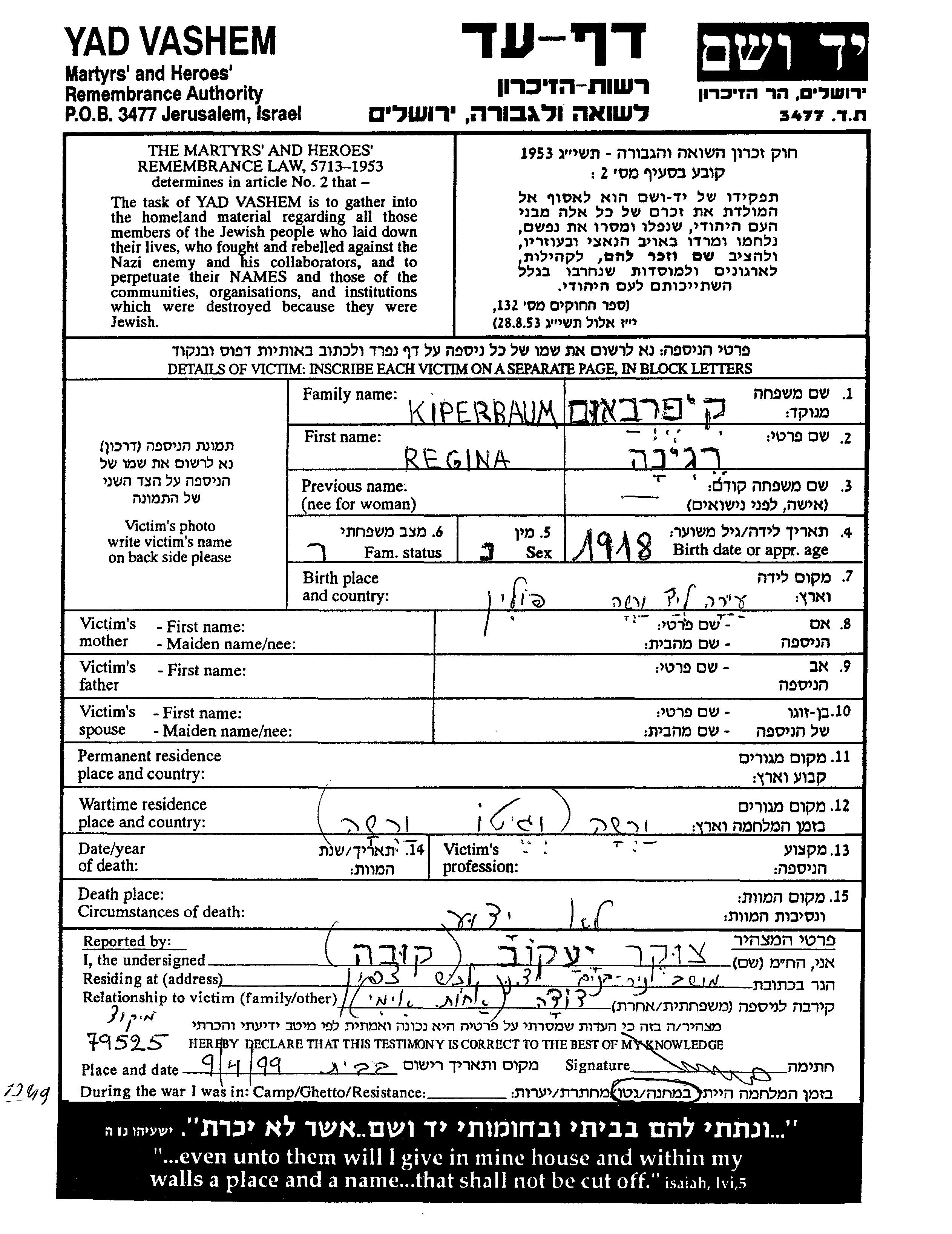 Kiperbaum Regina 1918 endroit inconnu, Feuille de témoignage