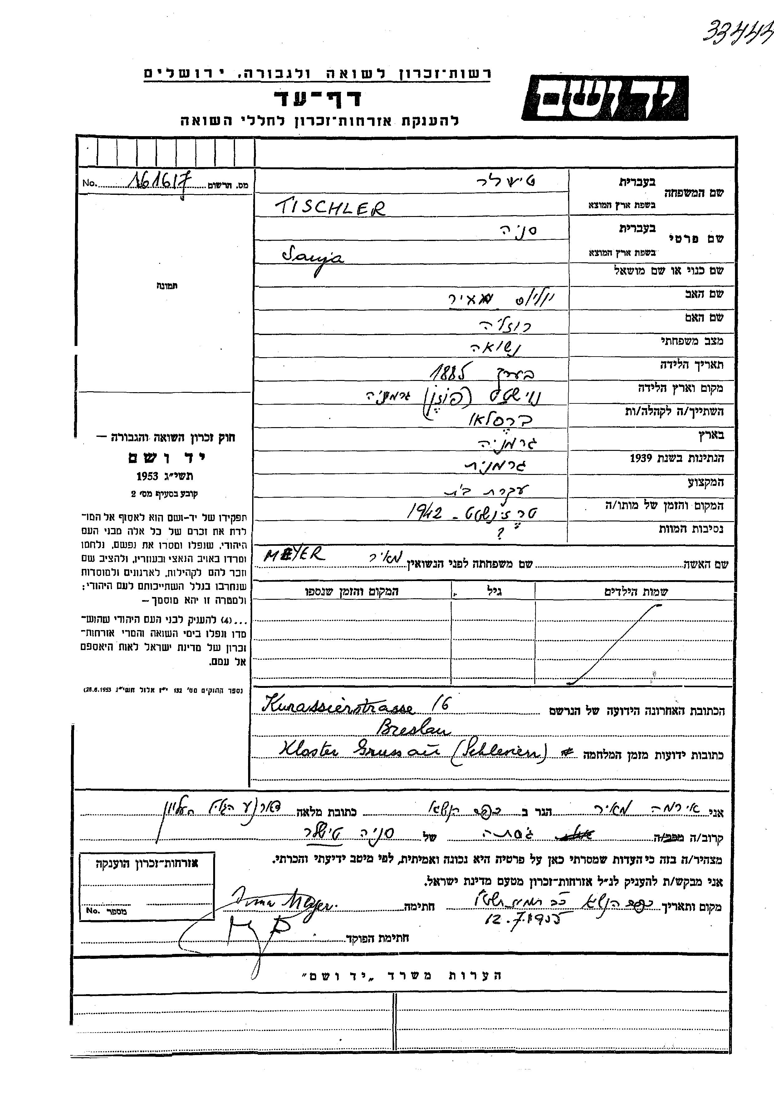 Tischler Sanja 1885 Breslau, Allemagne Feuille de témoignage