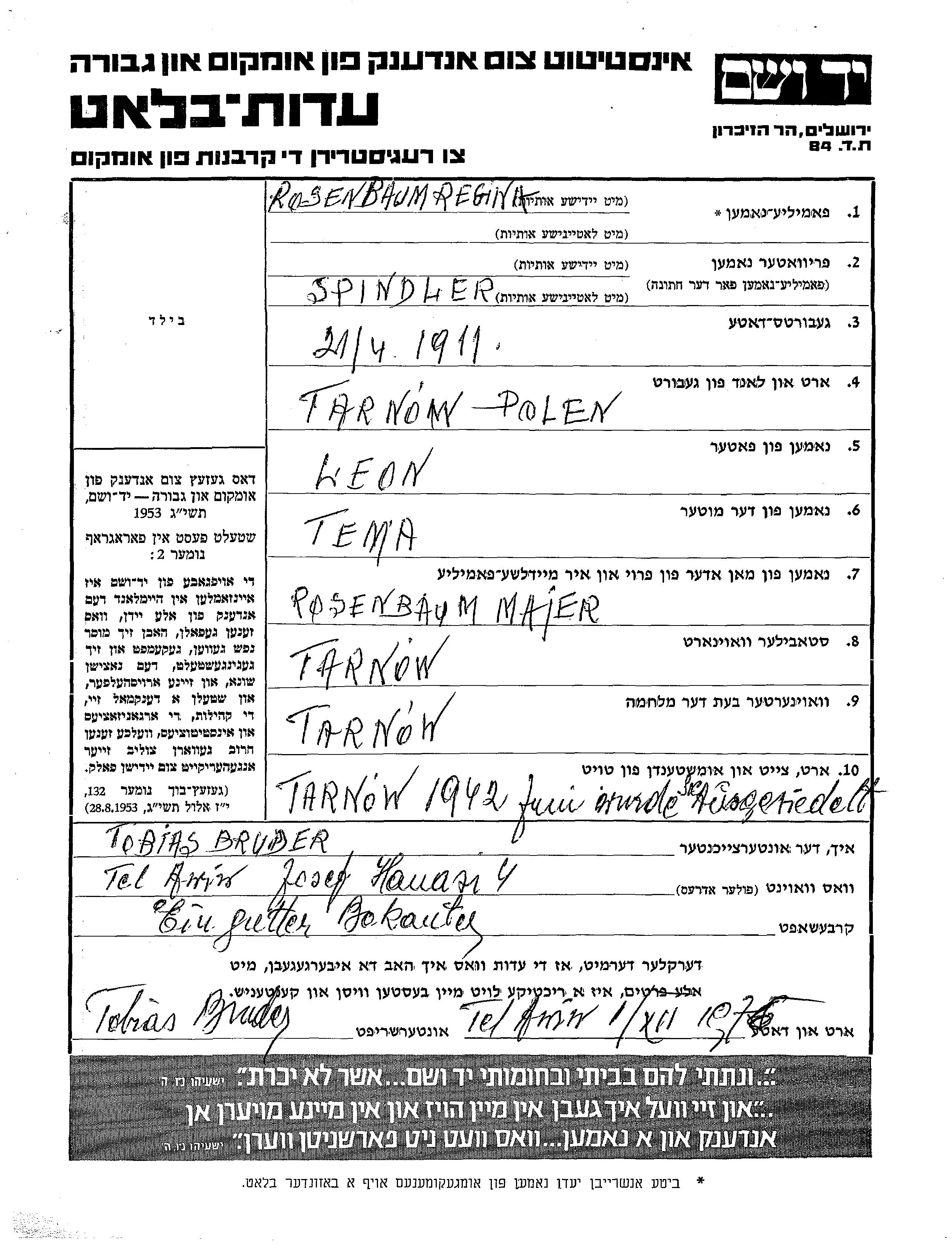 Rosenbaum Regina 1911 Tarnow, Pologne Feuille de témoignage