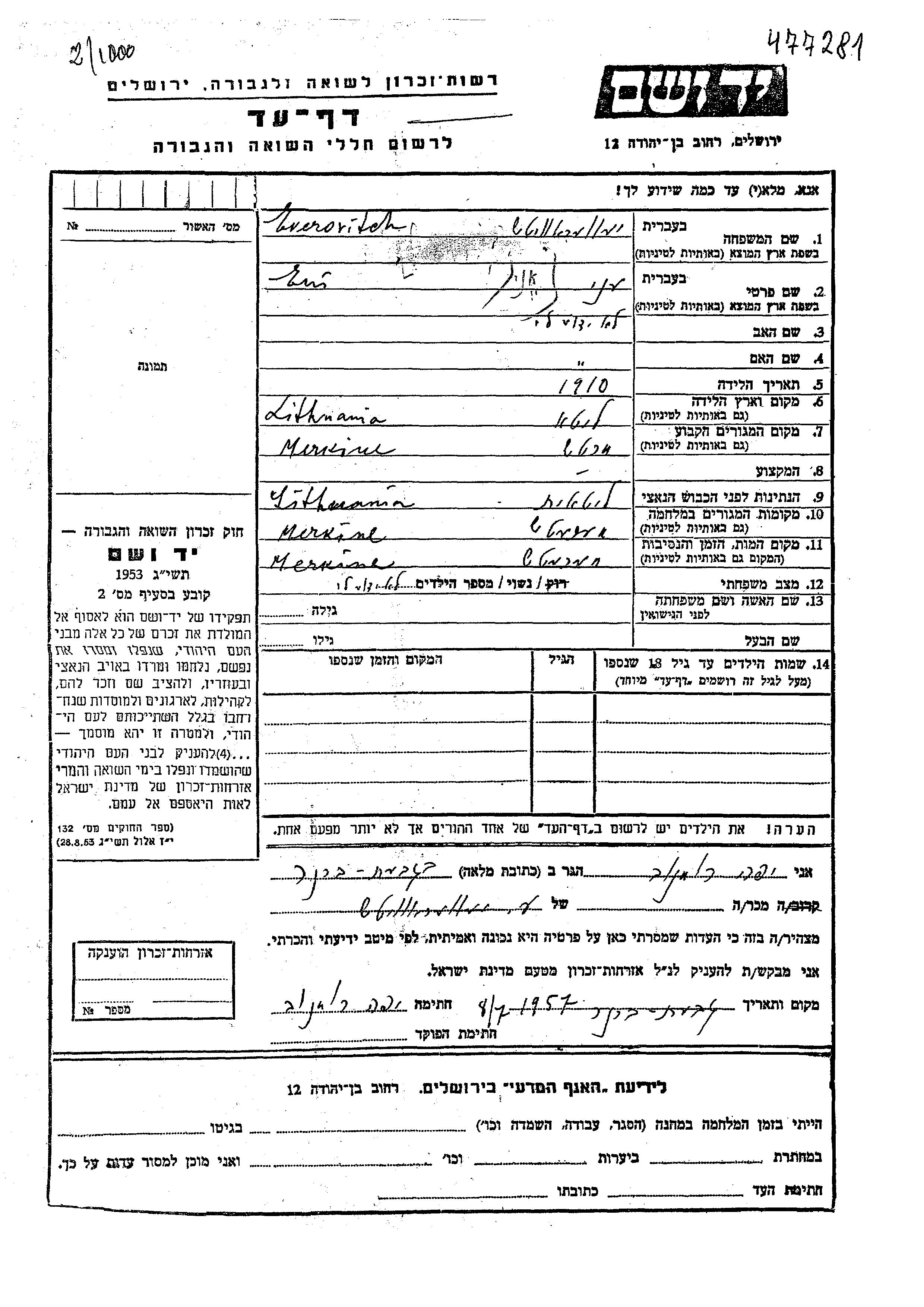 Yad Vashem - Pages of Testimony Names Memorial Collection