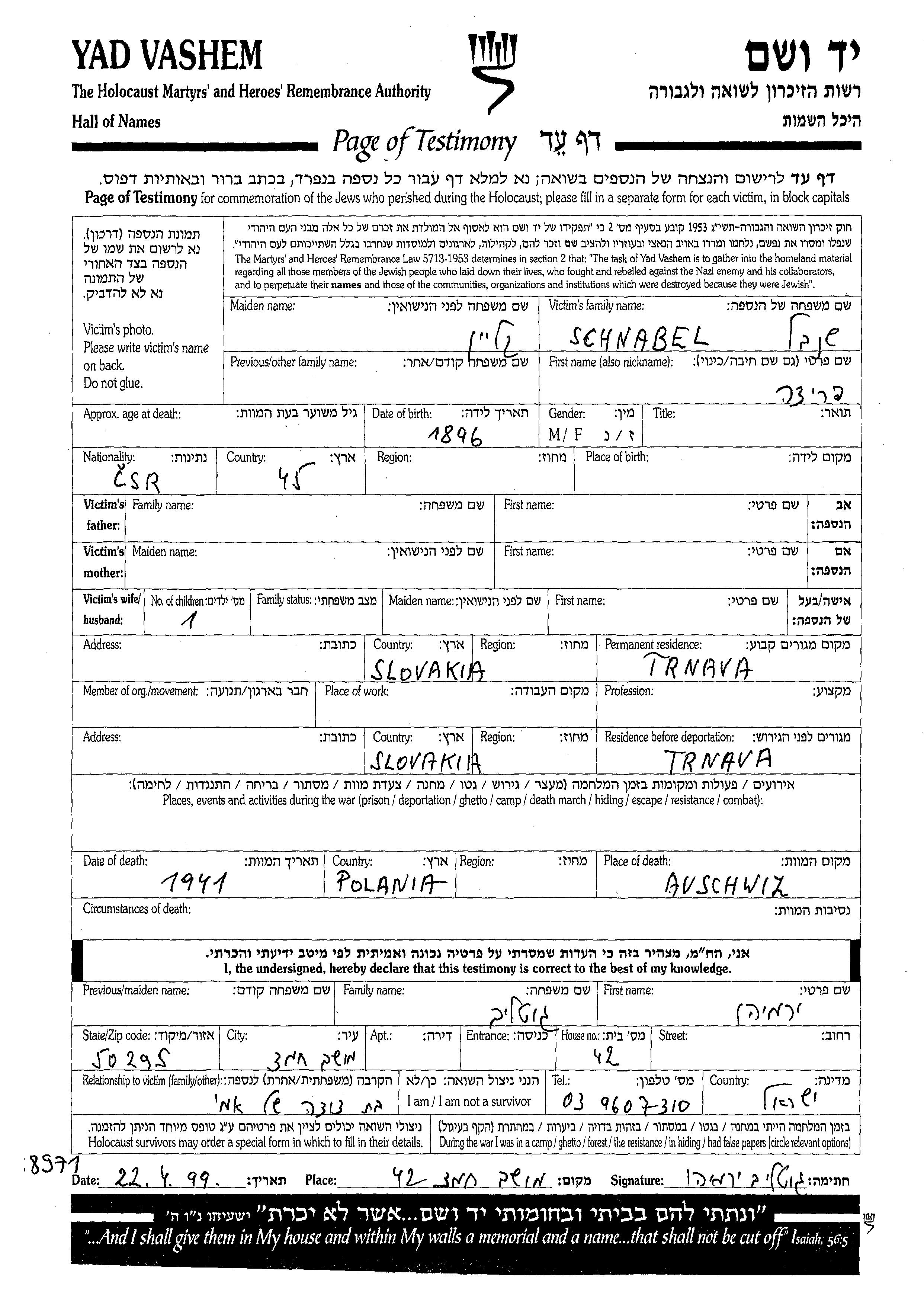 Schnabel Frida 1896 Trnava, Tchécoslovaquie Feuille de témoignage