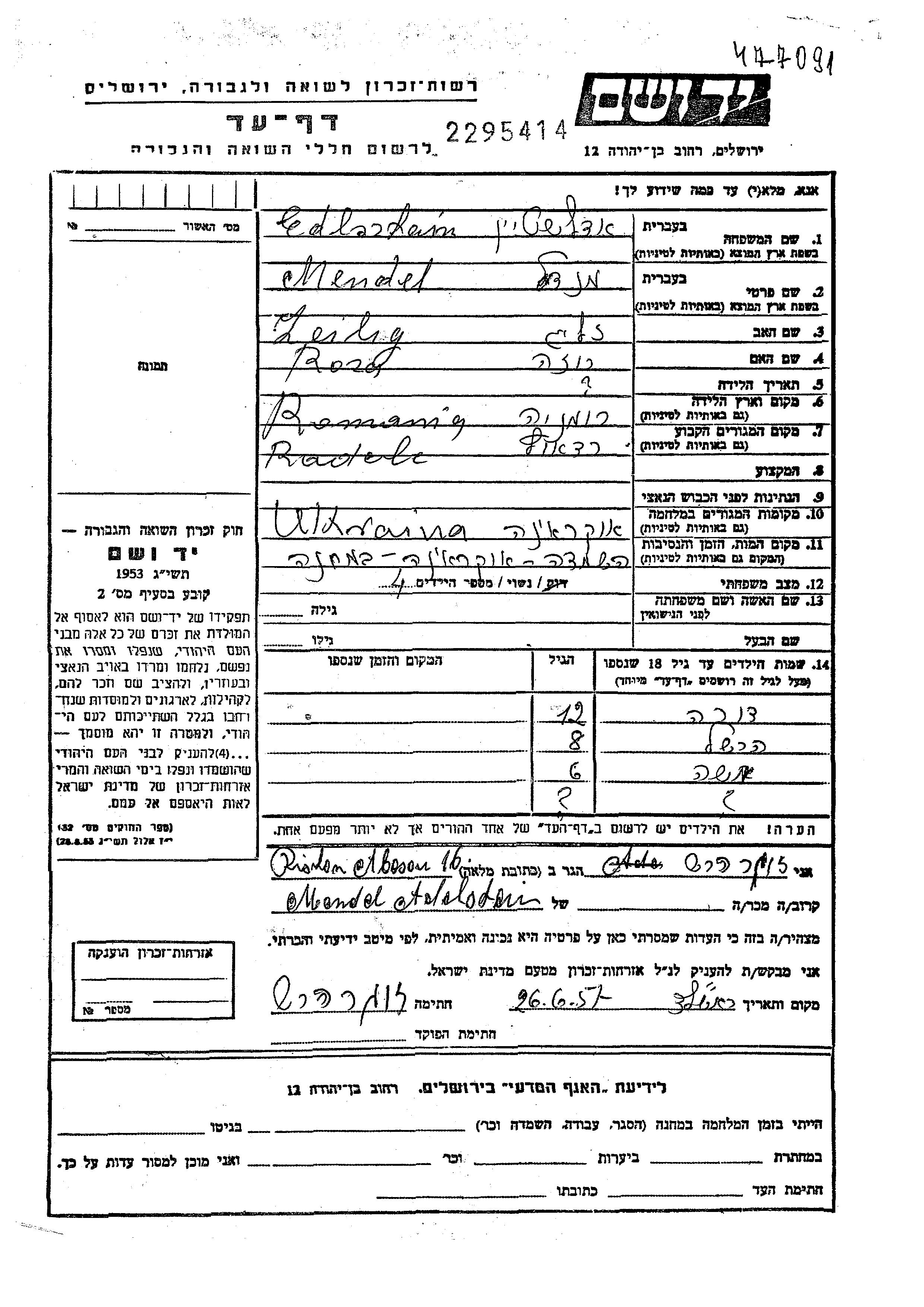 Edlsztain Mendel Radauc, Roumanie Feuille de témoignage